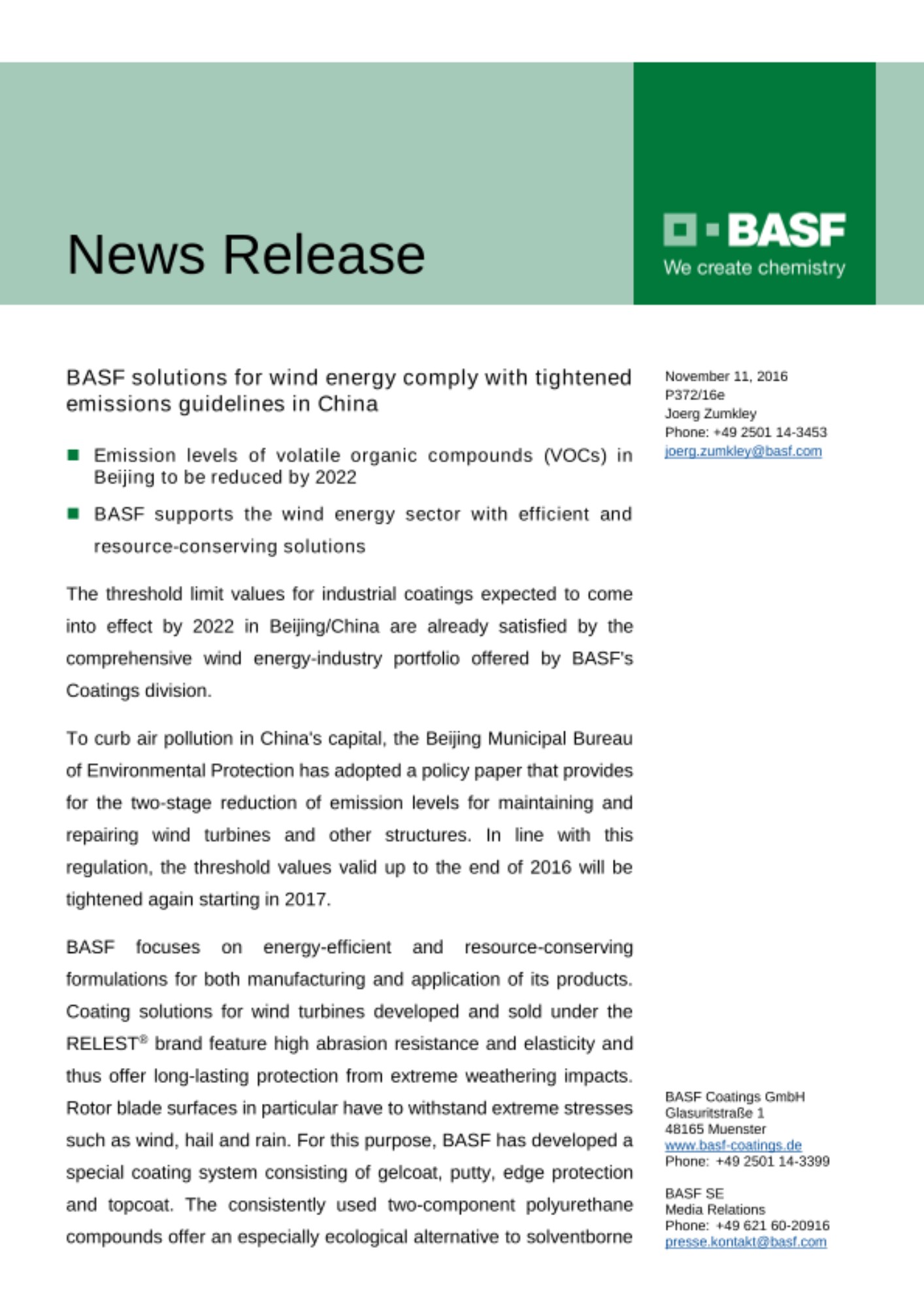 The threshold limit values for industrial coatings expected to come into effect by 2022 in Beijing/China are already satisfied by the comprehensive wind energy-industry portfolio offered by BASF's Coatings division.