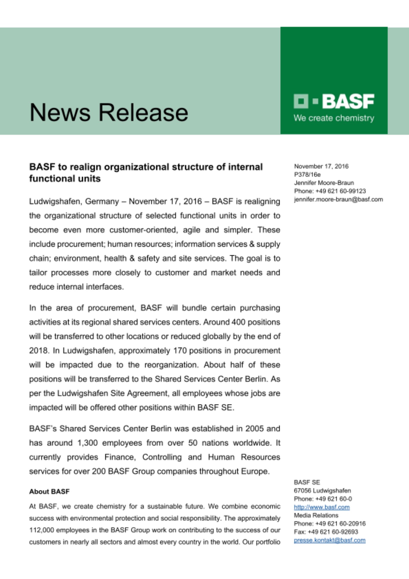Ludwigshafen, Germany – November 17, 2016 – BASF is realigning the organizational structure of selected functional units in order to become even more customer-oriented, agile and simpler. These include procurement; human resources; information services & supply chain; environment, health & safety and site services. The goal is to tailor processes more closely to customer and market needs and reduce internal interfaces.