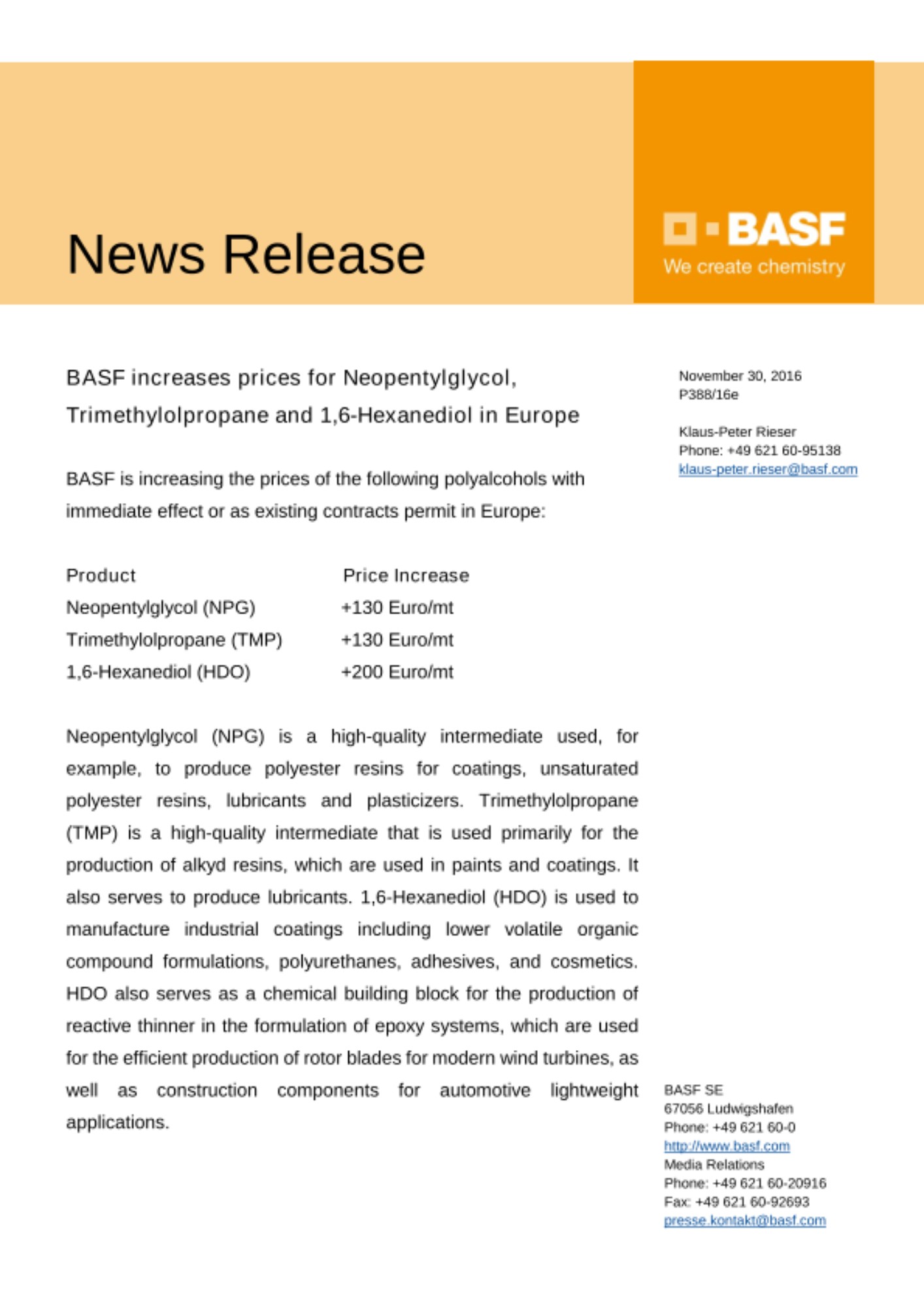 BASF increases prices for Neopentylglycol, Trimethylolpropane and 1,6-Hexanediol in Europe