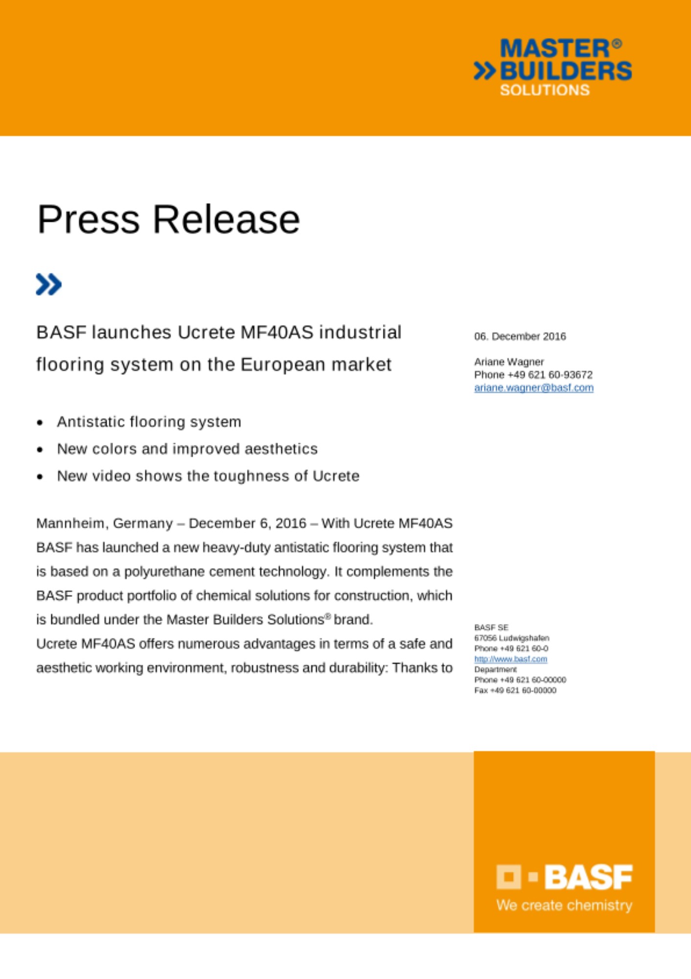 “Our customers’ demand for antistatic flooring systems is growing. This is a result of the EU ATEX (ATmosphères EXplosibles) directives that state requirements in the field of explosion protection, as well as the growing number of electronic components that are being used throughout industry. With the launch of Ucrete MF40AS we aim to meet this increasing demand and further strengthen our portfolio of industrial flooring solutions,” says Philip Ansell, European Marketing Manager for Ucrete Industrial Flooring at BASF. Ucrete MF40AS’s combination of chemical resistance, durability and antistatic features represents a unique offering for a safe working environment – especially for customers in the food, pharmaceutical and manufacturing industries.