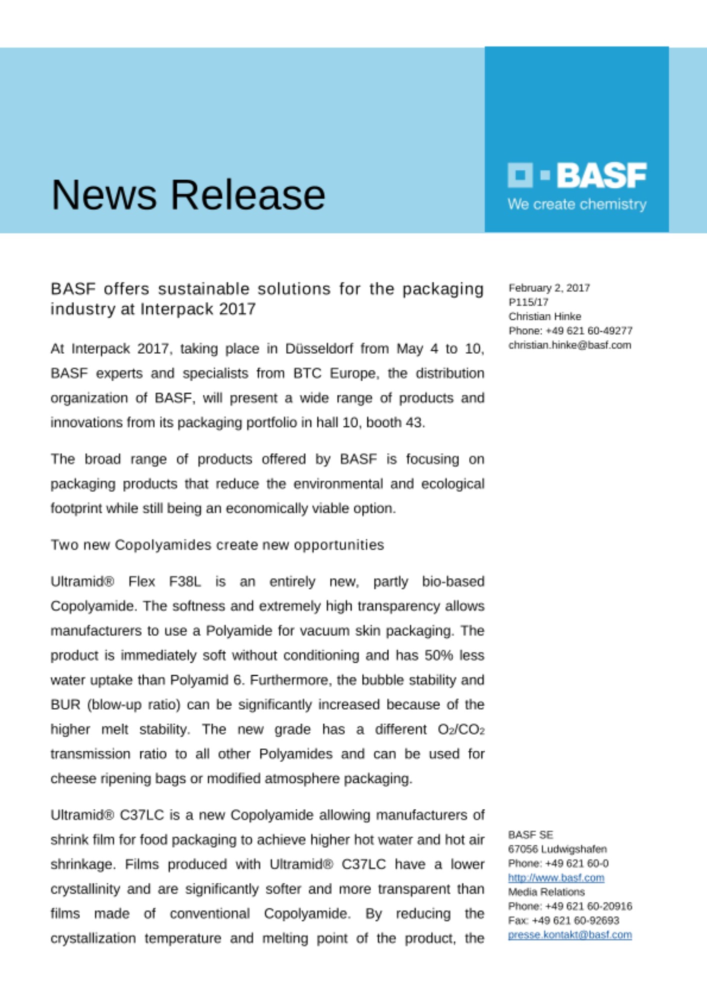 Further information can be found on the Interpack website of BASF at basf.com/interpack2017.