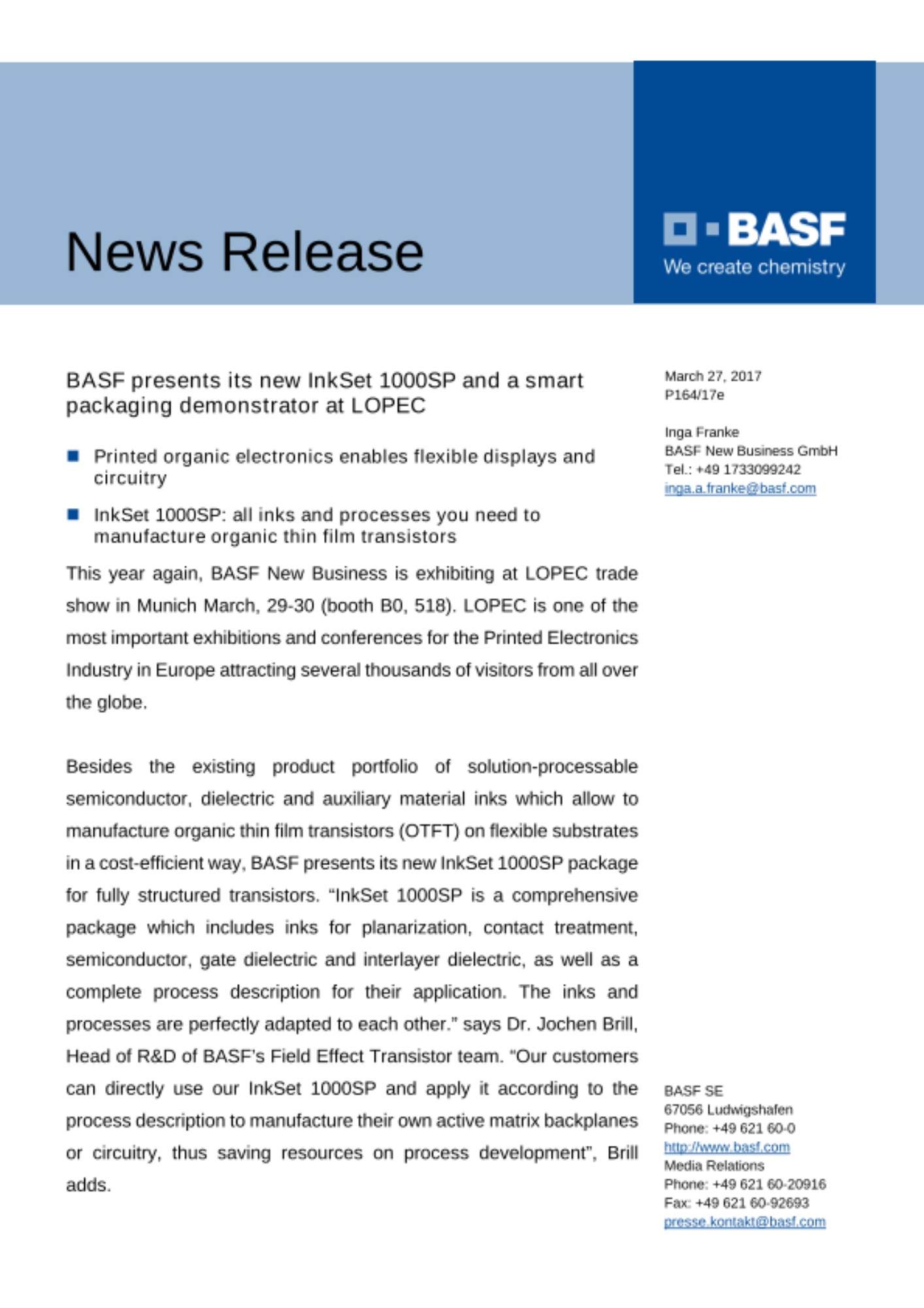 Besides the existing product portfolio of solution-processable semiconductor, dielectric and auxiliary material inks which allow to manufacture organic thin film transistors (OTFT) on flexible substrates in a cost-efficient way, BASF presents its new InkSet 1000SP package for fully structured transistors. “InkSet 1000SP is a comprehensive package which includes inks for planarization, contact treatment, semiconductor, gate dielectric and interlayer dielectric, as well as a complete process description for their application. The inks and processes are perfectly adapted to each other.” says Dr. Jochen Brill, Head of R&D of BASF’s Field Effect Transistor team. “Our customers can directly use our InkSet 1000SP and apply it according to the process description to manufacture their own active matrix backplanes or circuitry, thus saving resources on process development”, Brill adds.