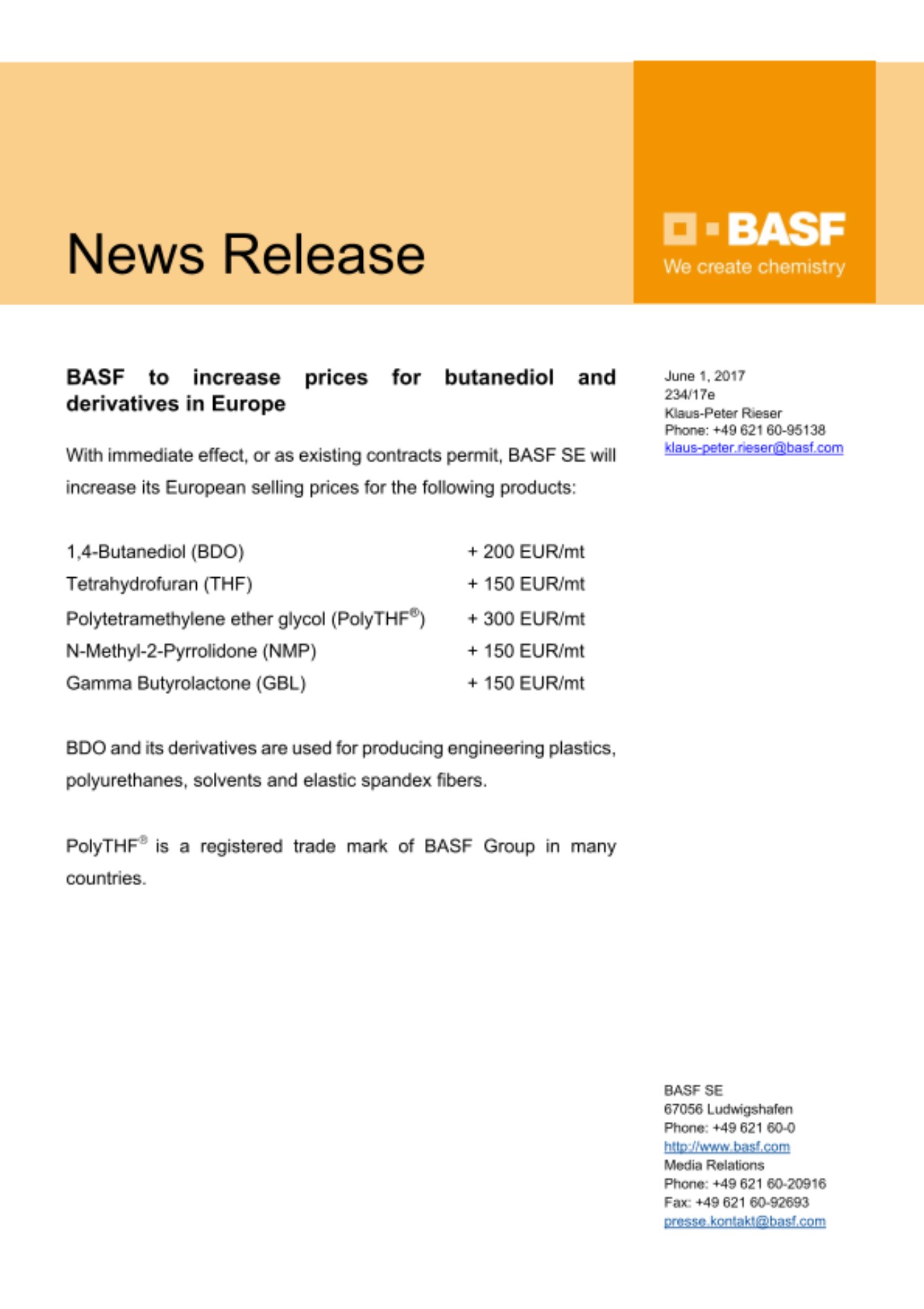 With immediate effect, or as existing contracts permit, BASF SE will increase its European selling prices for the following products: