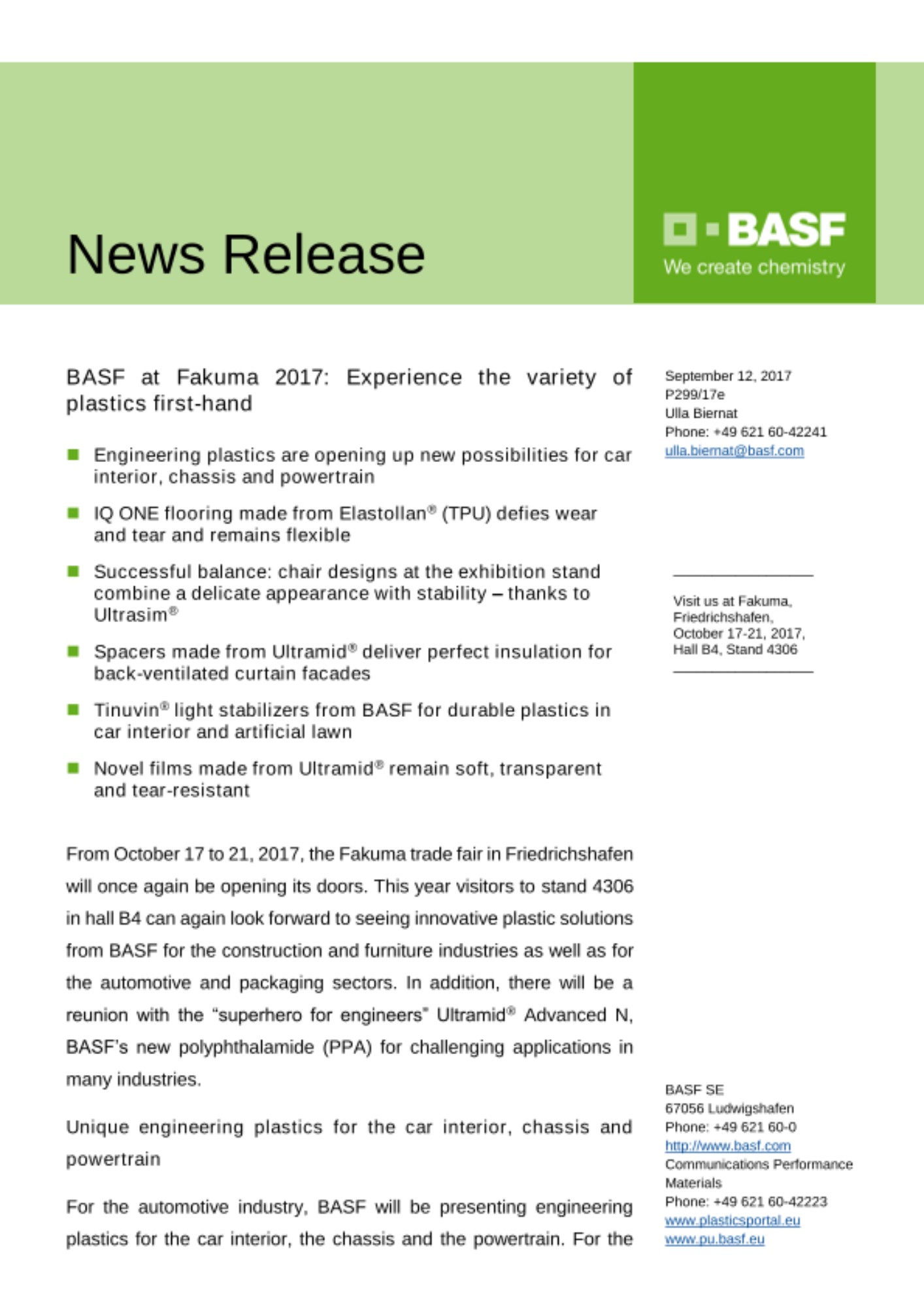 From October 17 to 21, 2017, the Fakuma trade fair in Friedrichshafen will once again be opening its doors. This year visitors to stand 4306 in hall B4 can again look forward to seeing innovative plastic solutions from BASF for the construction and furniture industries as well as for the automotive and packaging sectors. In addition, there will be a reunion with the “superhero for engineers” Ultramid® Advanced N, BASF’s new polyphthalamide (PPA) for challenging applications in many industries.