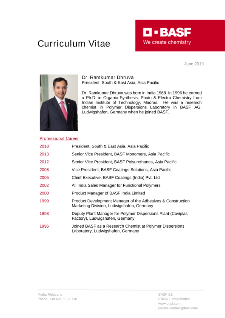 Ramkumar Dhruva (51), President, South & East Asia, ASEAN & ANZ, BASF East Asia RHQ Ltd., Hong Kong, will assume responsibility for the Division Monomers, BASF Belgium Coordination Center Comm. V., Waterloo, effective July 1, 2019. The current head, Kenneth T. Lane (51), has decided to leave the company.