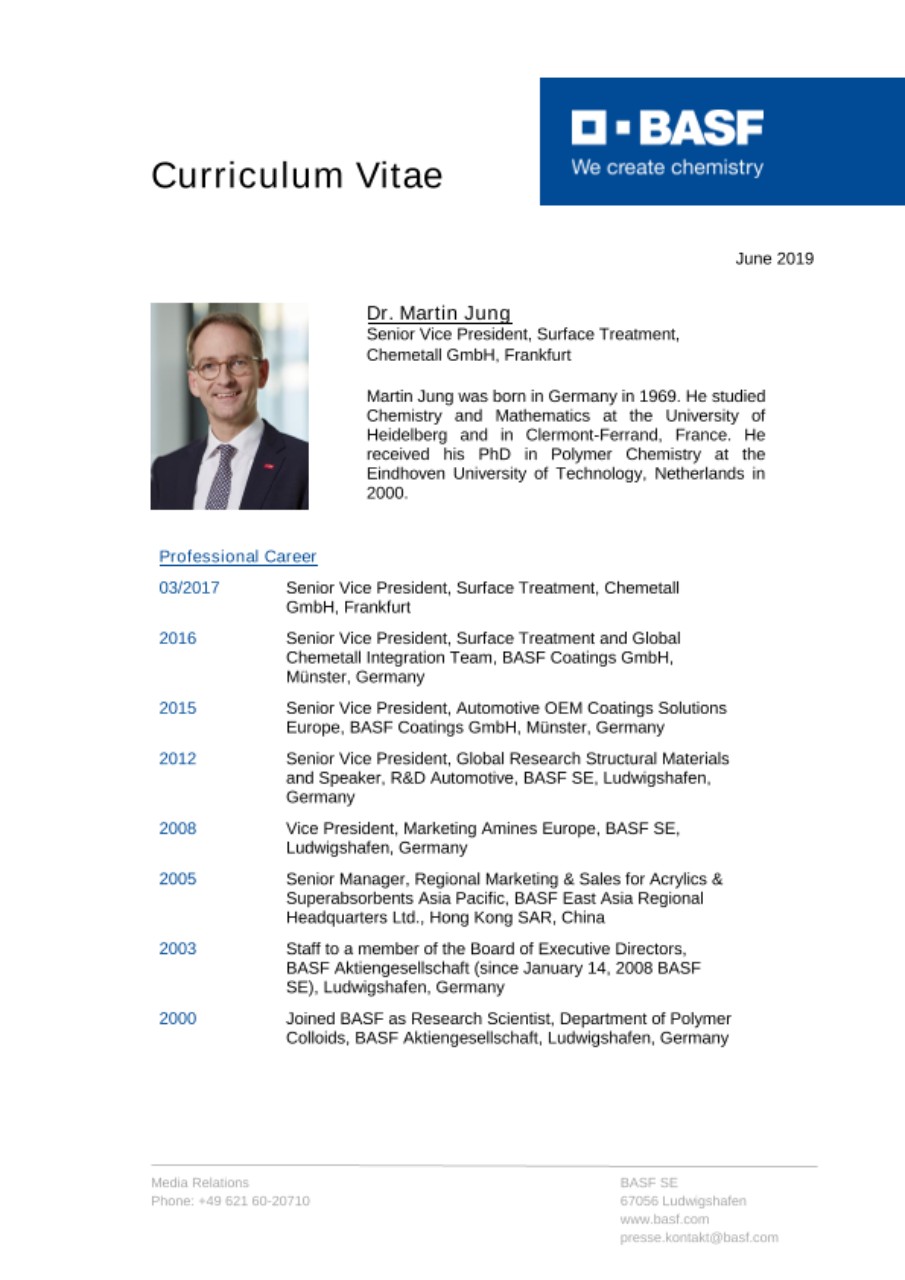 Martin Jung (50), Senior Vice President, Surface Treatment, Chemetall GmbH, Frankfurt, will join Performance Materials on August 1, 2019, and will, as President, succeed Raimar Jahn effective September 1, 2019.