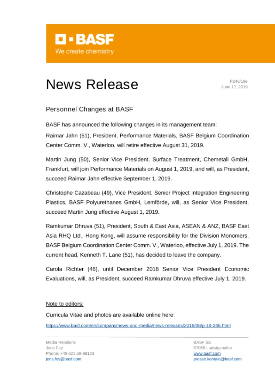 Raimar Jahn (61), President, Performance Materials, BASF Belgium Coordination Center Comm. V., Waterloo, will retire effective August 31, 2019.