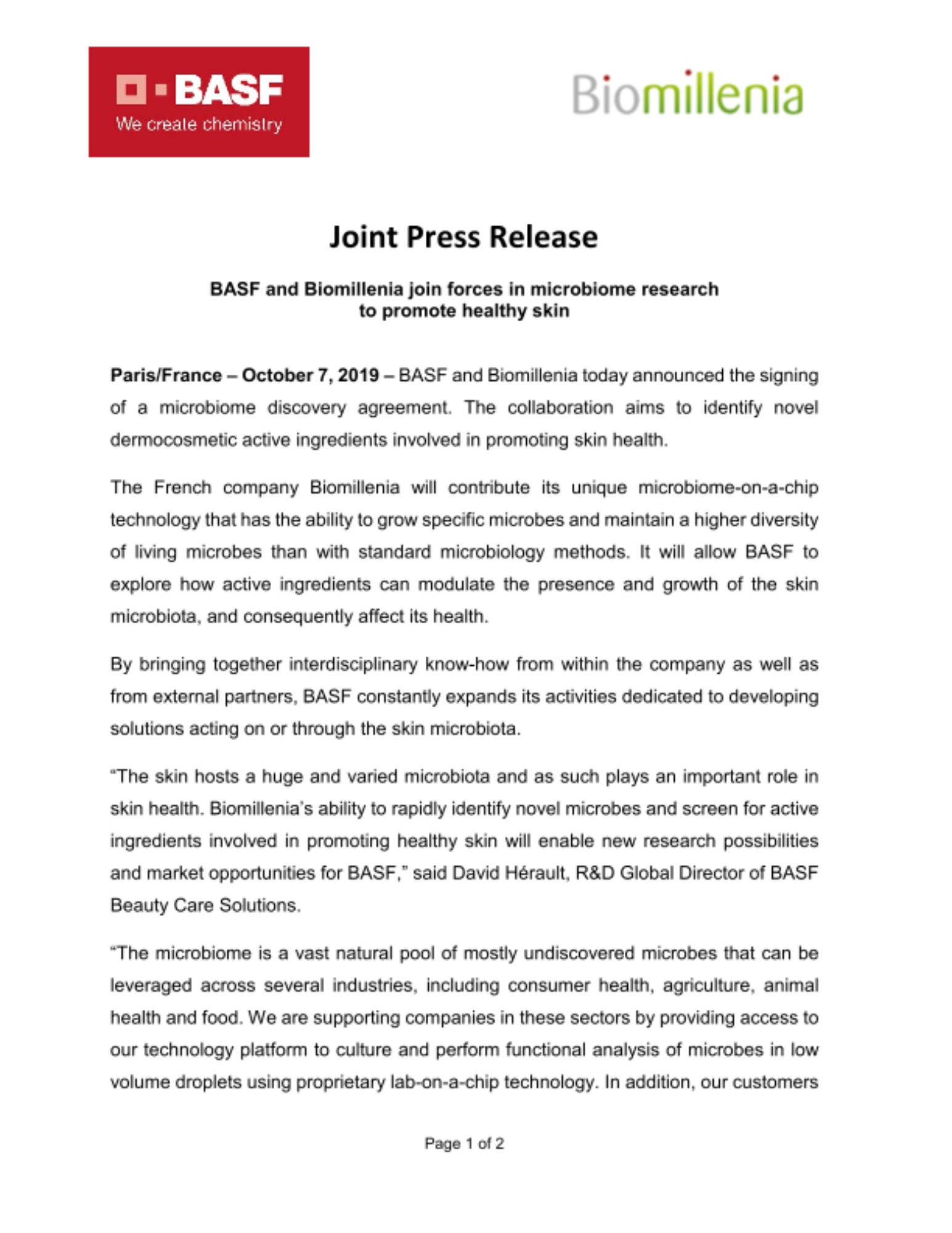 Paris/France – October 7, 2019 – BASF and Biomillenia today announced the signing of a microbiome discovery agreement. The collaboration aims to identify novel dermocosmetic active ingredients involved in promoting skin health.