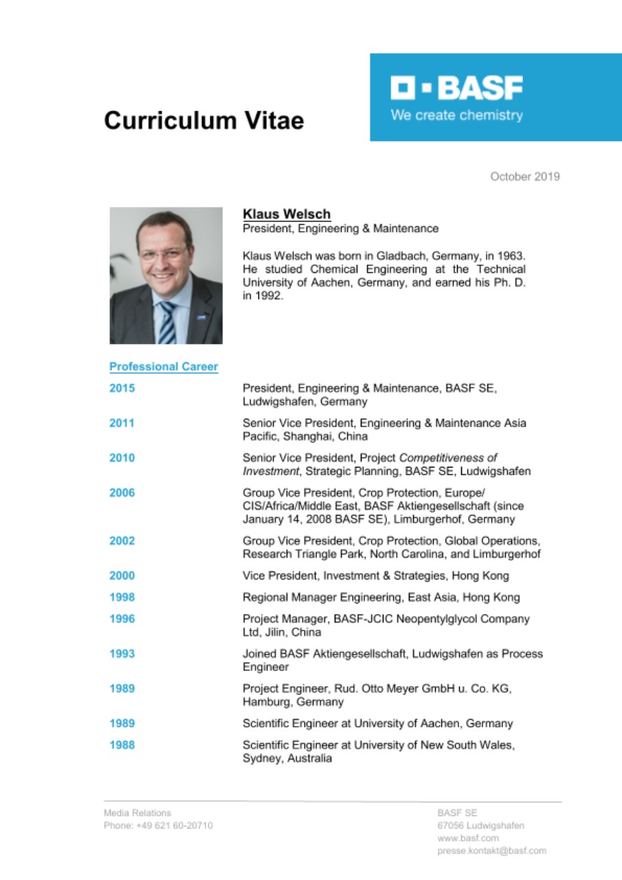 Klaus Welsch (56), President, Engineering & Technical Expertise, Ludwigshafen, will assume responsibility for the new Division „Mega Projects Asia”, BASF (China) Company Ltd., Shanghai, effective January 1, 2020. These include the company’s proposed new integrated chemical production (“Verbund”) site in Zhanjiang (China) as well as the new chemical complex in Mundra (India), in which BASF is engaged with Adani, ADNOC and Borealis for its development.