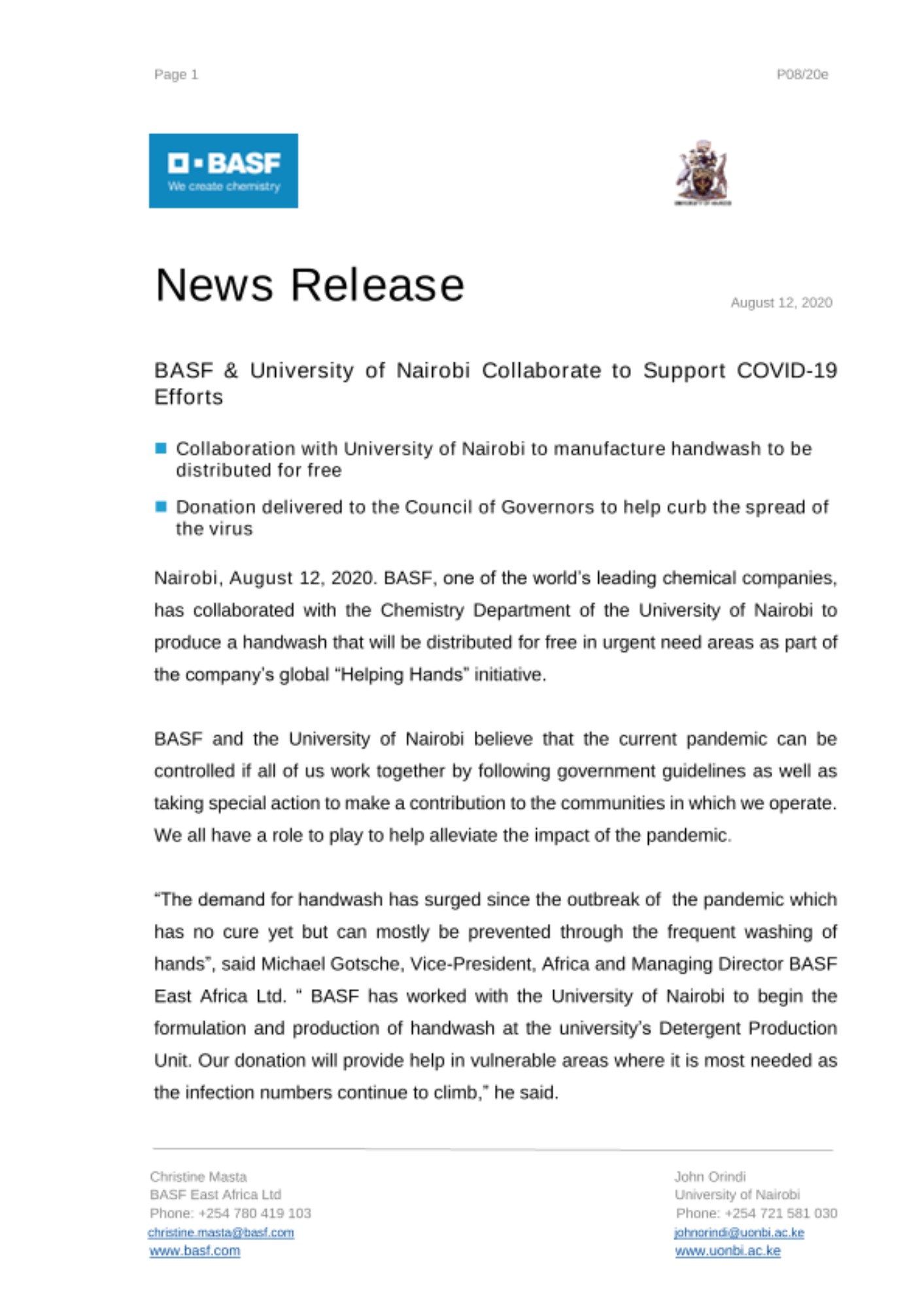 Nairobi, August 12, 2020. BASF, one of the world’s leading chemical companies, has collaborated with the Chemistry Department of the University of Nairobi to produce a handwash that will be distributed for free in urgent need areas as part of the company’s global “Helping Hands” initiative.