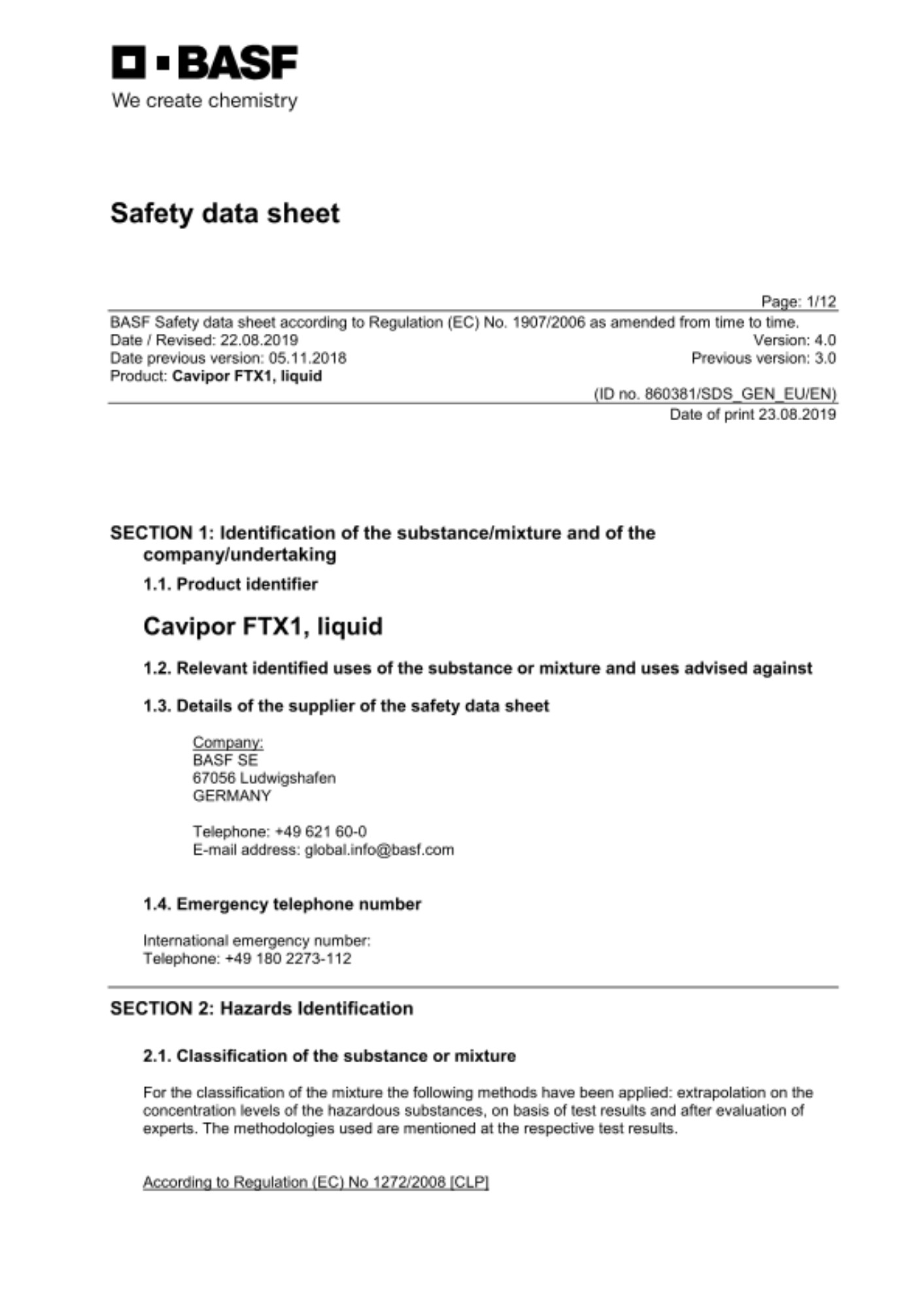 Safety Data Sheet Cavipor FTX1, liquid