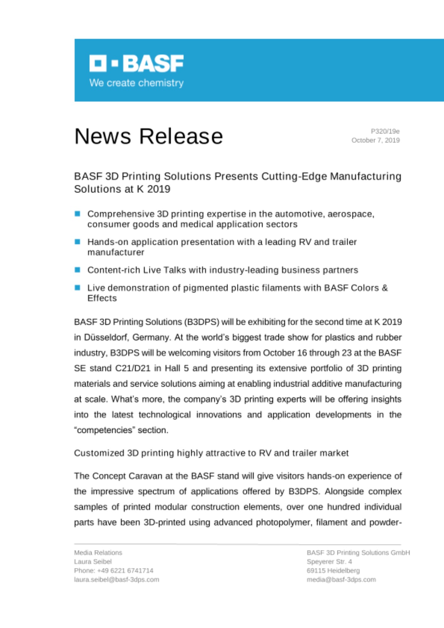 BASF 3D Printing Solutions (B3DPS) will be exhibiting for the second time at K 2019 in Düsseldorf, Germany. At the world’s biggest trade show for plastics and rubber industry, B3DPS will be welcoming visitors from October 16 through 23 at the BASF SE stand C21/D21 in Hall 5 and presenting its extensive portfolio of 3D printing materials and service solutions aiming at enabling industrial additive manufacturing at scale. What’s more, the company’s 3D printing experts will be offering insights into the latest technological innovations and application developments in the “competencies” section.