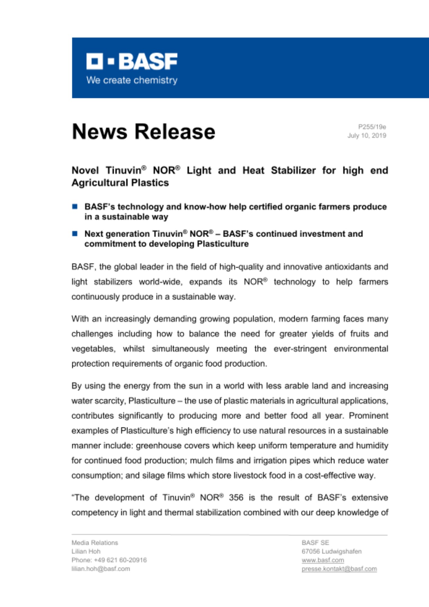 BASF, the global leader in the field of high-quality and innovative antioxidants and light stabilizers world-wide, expands its NOR® technology to help farmers continuously produce in a sustainable way.