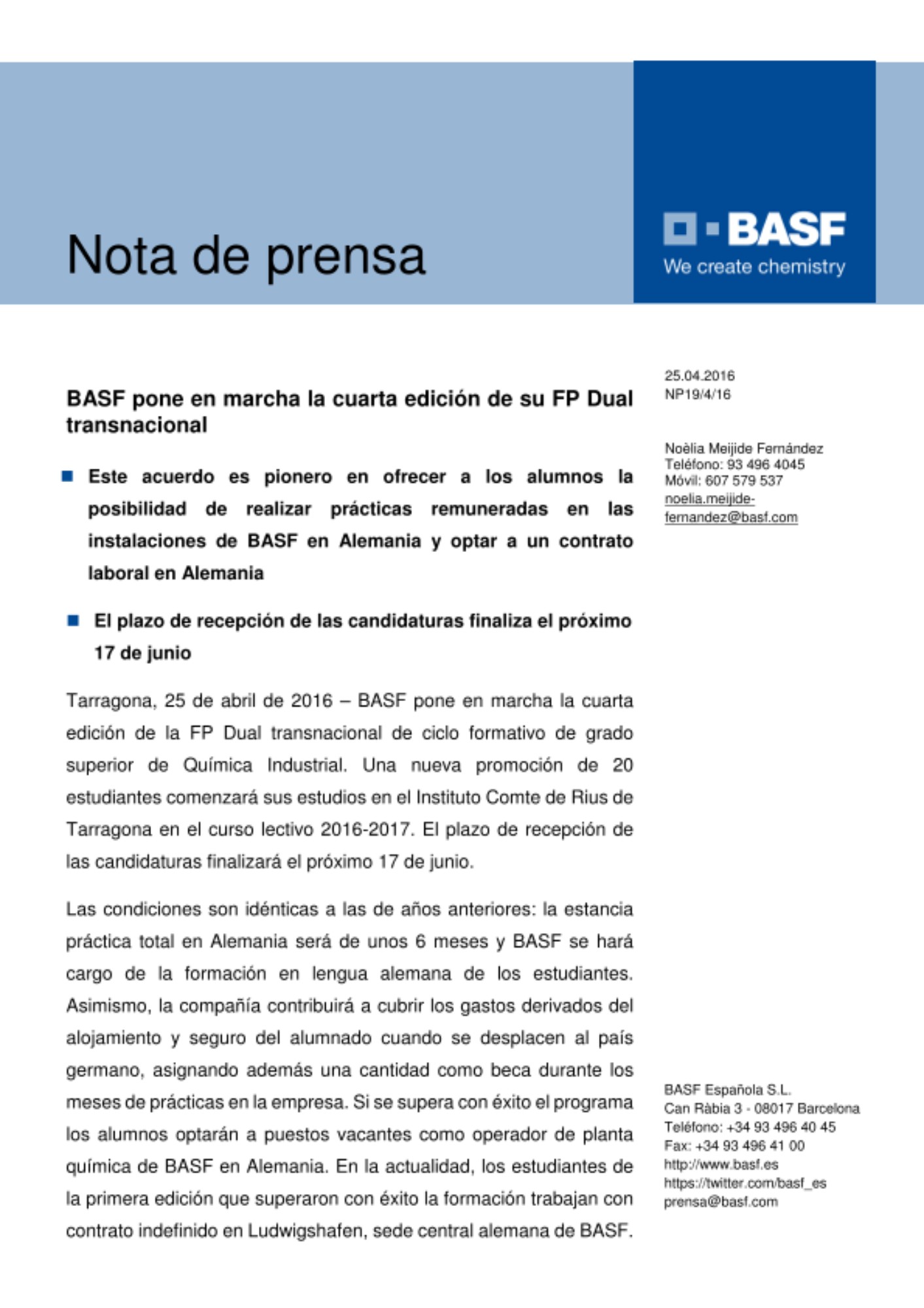 Tarragona, 25 de abril de 2016 – BASF pone en marcha la cuarta edición de la FP Dual transnacional de ciclo formativo de grado superior de Química Industrial. Una nueva promoción de 20 estudiantes comenzará sus estudios en el Instituto Comte de Rius de Tarragona en el curso lectivo 2016-2017. El plazo de recepción de las candidaturas finalizará el próximo 17 de junio.