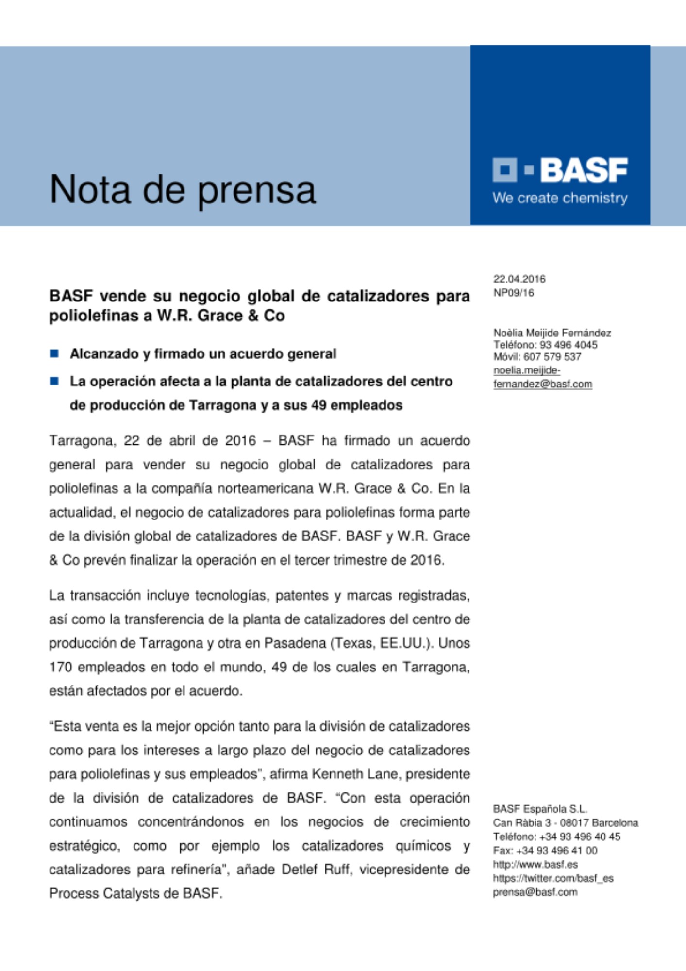 Tarragona, 22 de abril de 2016 – BASF ha firmado un acuerdo general para vender su negocio global de catalizadores para poliolefinas a la compañía norteamericana W.R. Grace & Co. En la actualidad, el negocio de catalizadores para poliolefinas forma parte de la división global de catalizadores de BASF. BASF y W.R. Grace & Co prevén finalizar la operación en el tercer trimestre de 2016.