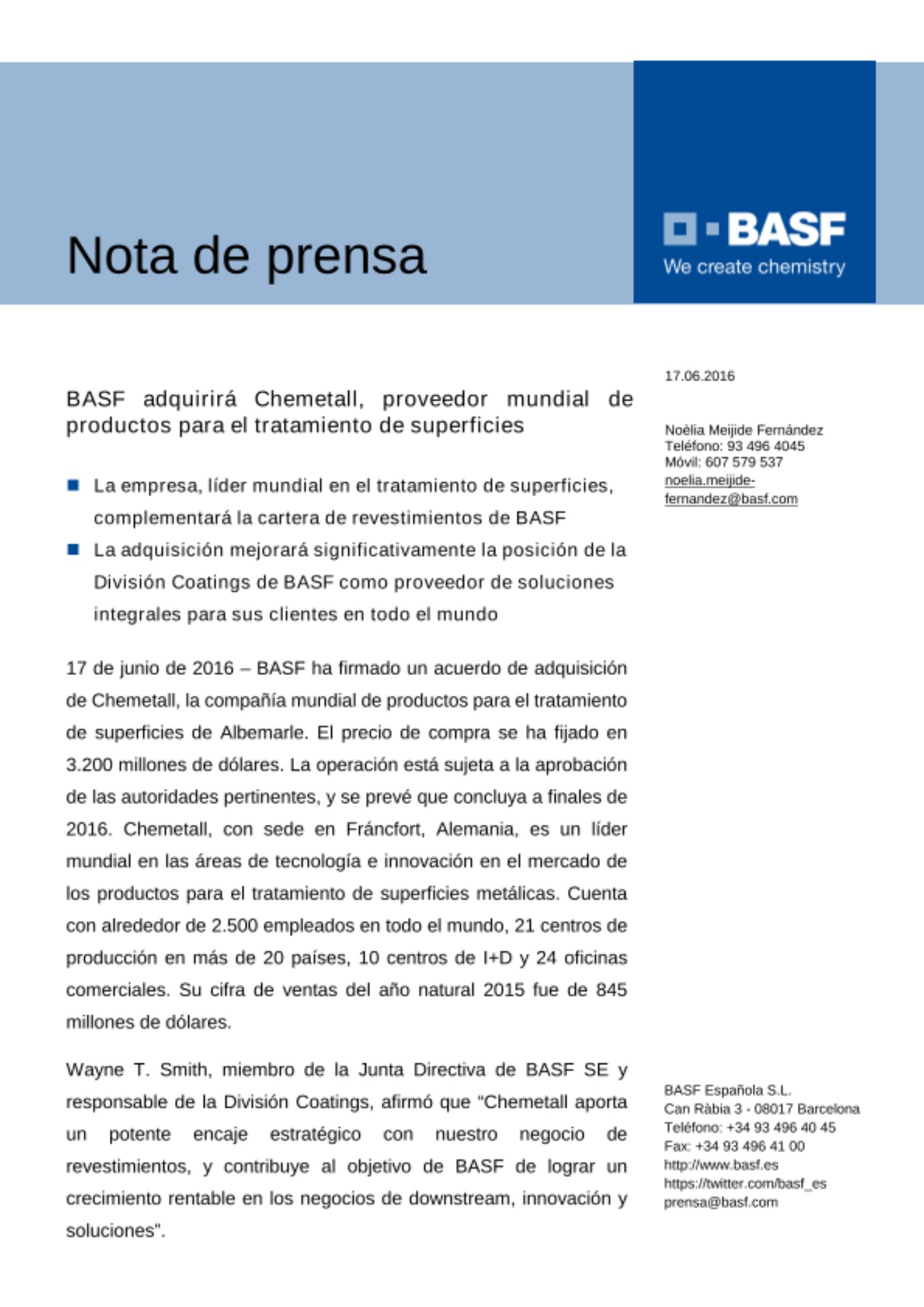 Wayne T. Smith, miembro de la Junta Directiva de BASF SE y responsable de la División Coatings, afirmó que “Chemetall aporta un potente encaje estratégico con nuestro negocio de revestimientos, y contribuye al objetivo de BASF de lograr un crecimiento rentable en los negocios de downstream, innovación y soluciones”.