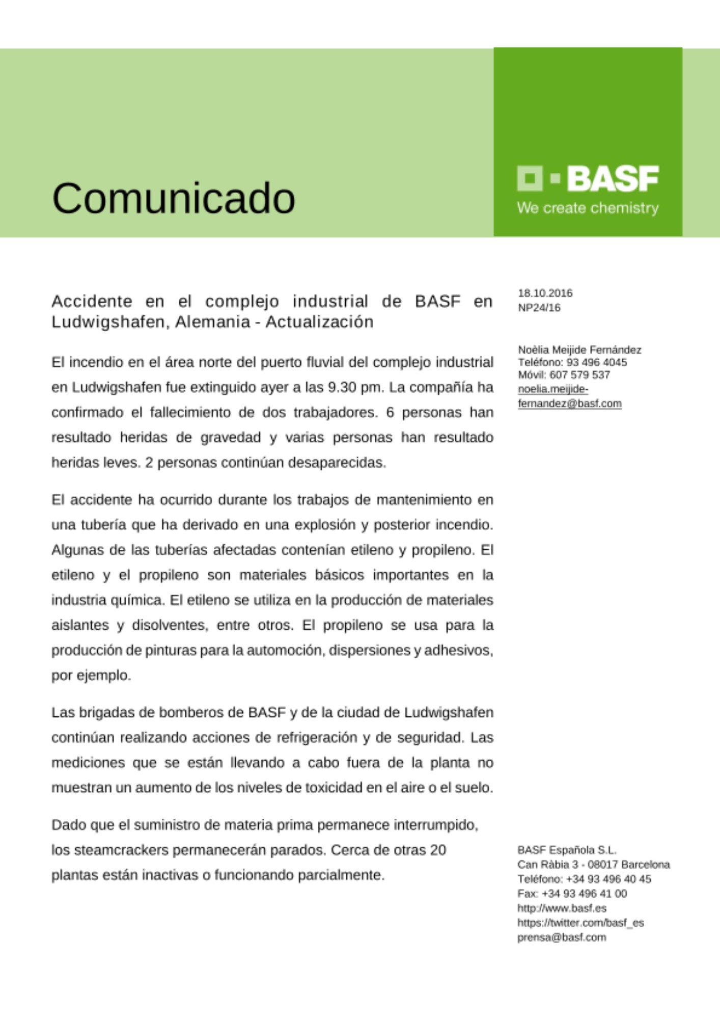 El incendio en el área norte del puerto fluvial del complejo industrial en Ludwigshafen fue extinguido ayer a las 9.30 pm. La compañía ha confirmado el fallecimiento de 2 trabajadores. 6 personas han resultado heridas de gravedad y varias personas han resultado heridas leves. 2 personas continúan desaparecidas.