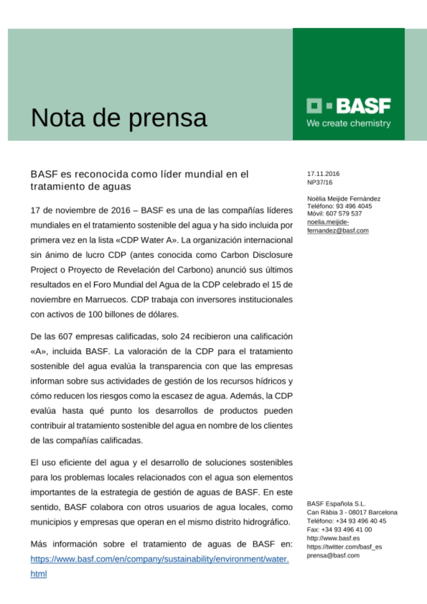 17 de noviembre de 2016 – BASF es una de las compañías líderes mundiales en el tratamiento sostenible del agua y ha sido incluida por primera vez en la lista «CDP Water A». La organización internacional sin ánimo de lucro CDP (antes conocida como Carbon Disclosure Project o Proyecto de Revelación del Carbono) anunció sus últimos resultados en el Foro Mundial del Agua de la CDP celebrado el 15 de noviembre en Marruecos. CDP trabaja con inversores institucionales con activos de 100 billones de dólares.