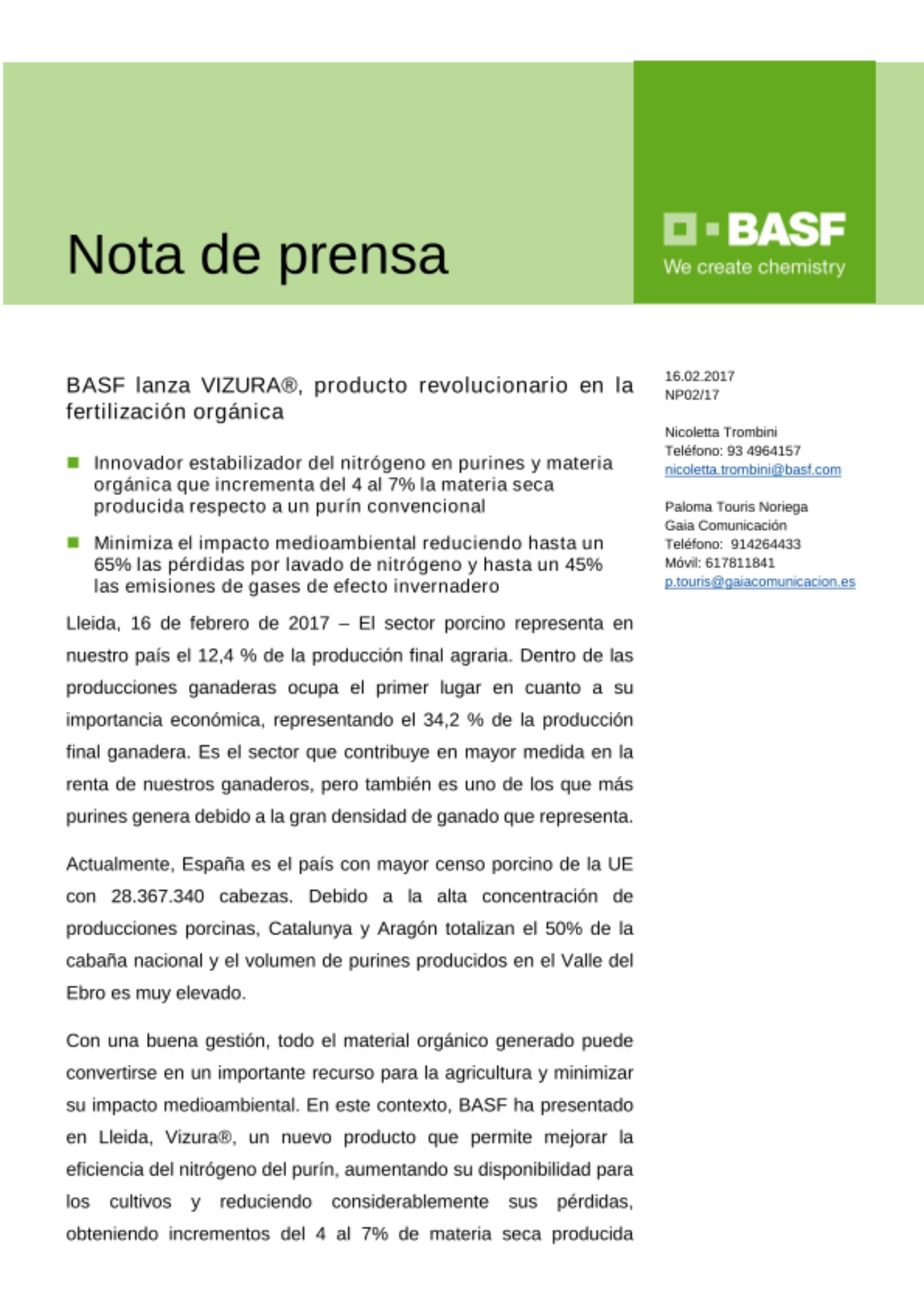 Con una buena gestión, todo el material orgánico generado puede convertirse en un importante recurso para la agricultura y minimizar su impacto medioambiental. En este contexto, BASF ha presentado en Lleida, Vizura®, un nuevo producto que permite mejorar la eficiencia del nitrógeno del purín, aumentando su disponibilidad para los cultivos y reduciendo considerablemente sus pérdidas, obteniendo incrementos del 4 al 7% de materia seca producida respecto a un purín convencional. Como fertilizante, supone un ahorro considerable de insumos y flexibilidad en el plan de trabajo del agricultor.