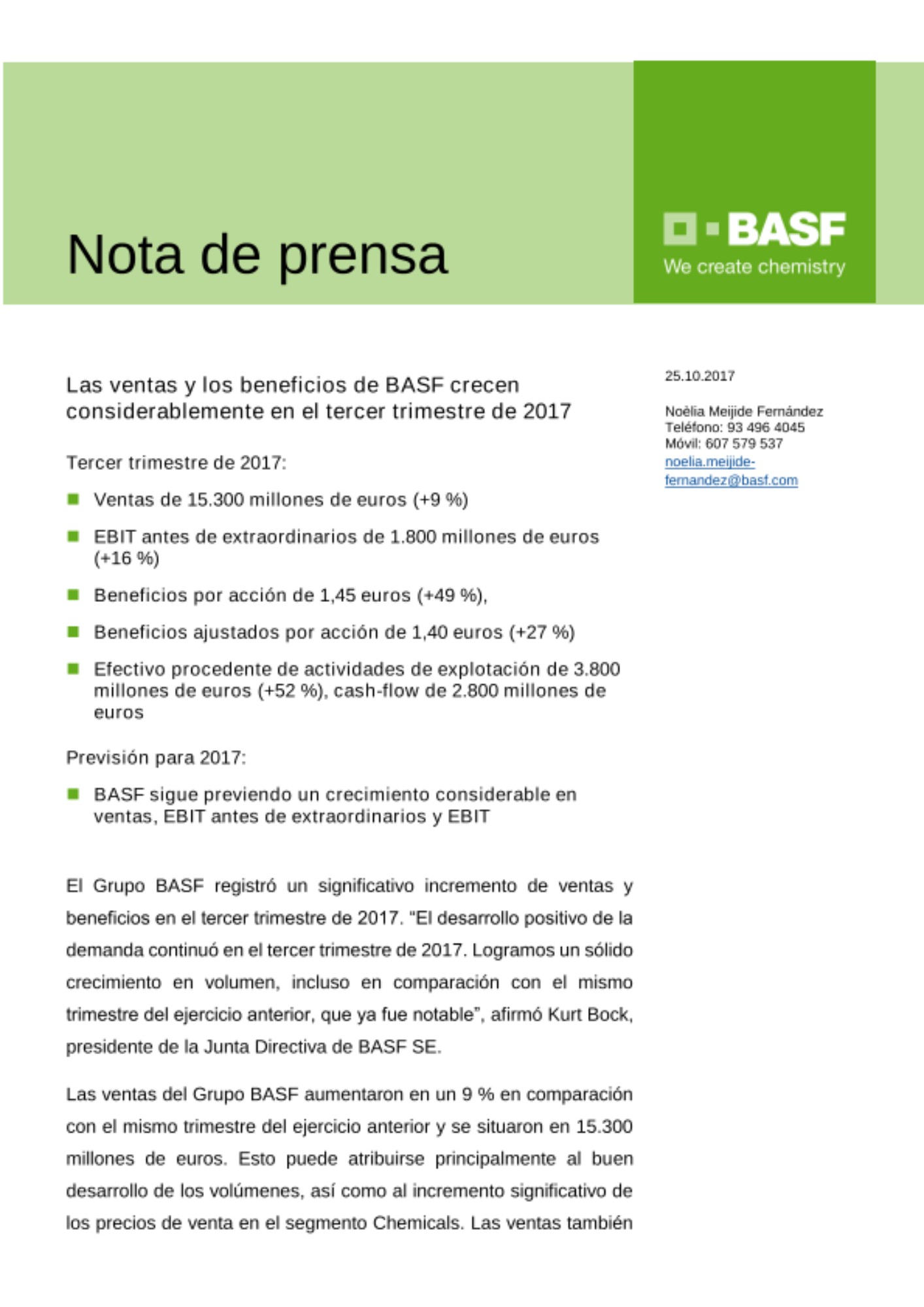 El Grupo BASF registró un significativo incremento de ventas y beneficios en el tercer trimestre de 2017. “El desarrollo positivo de la demanda continuó en el tercer trimestre de 2017. Logramos un sólido crecimiento en volumen, incluso en comparación con el mismo trimestre del ejercicio anterior, que ya fue notable”, afirmó Kurt Bock, presidente de la Junta Directiva de BASF SE.