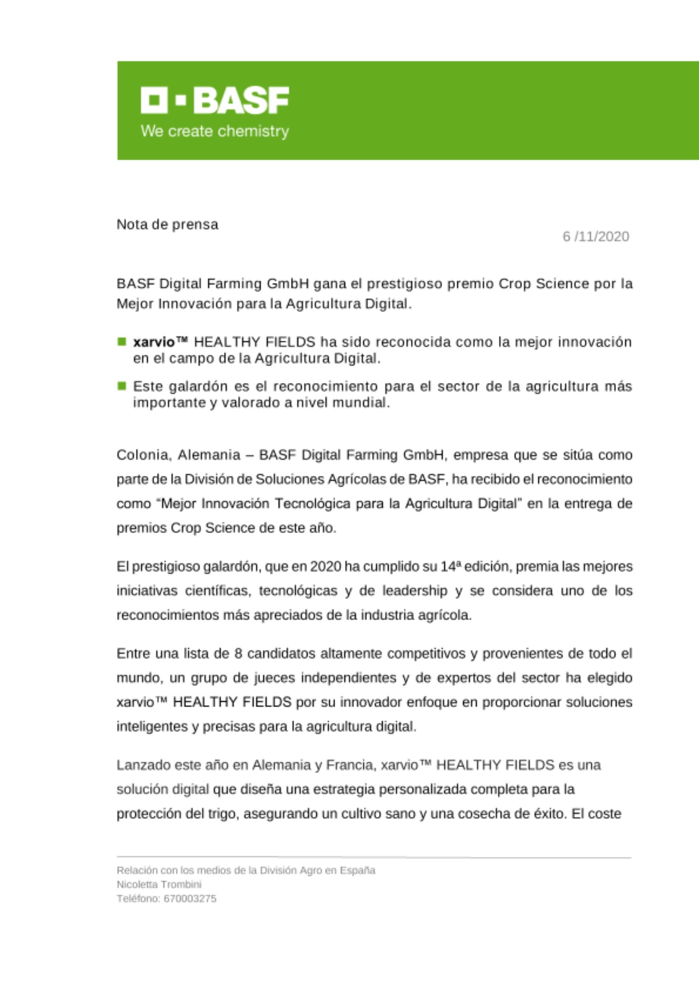 Vincent Gros, Presidente de la División de Soluciones Agrícolas de BASF, hamanifestado que “el premio Crop Science es un reconocimiento a la creatividad e innovación de nuestra División de Digital Farming. Nos complace mucho haber recibido este reconocimiento de xarvio™ HEALTHY FIELDS y de nuestros logros.