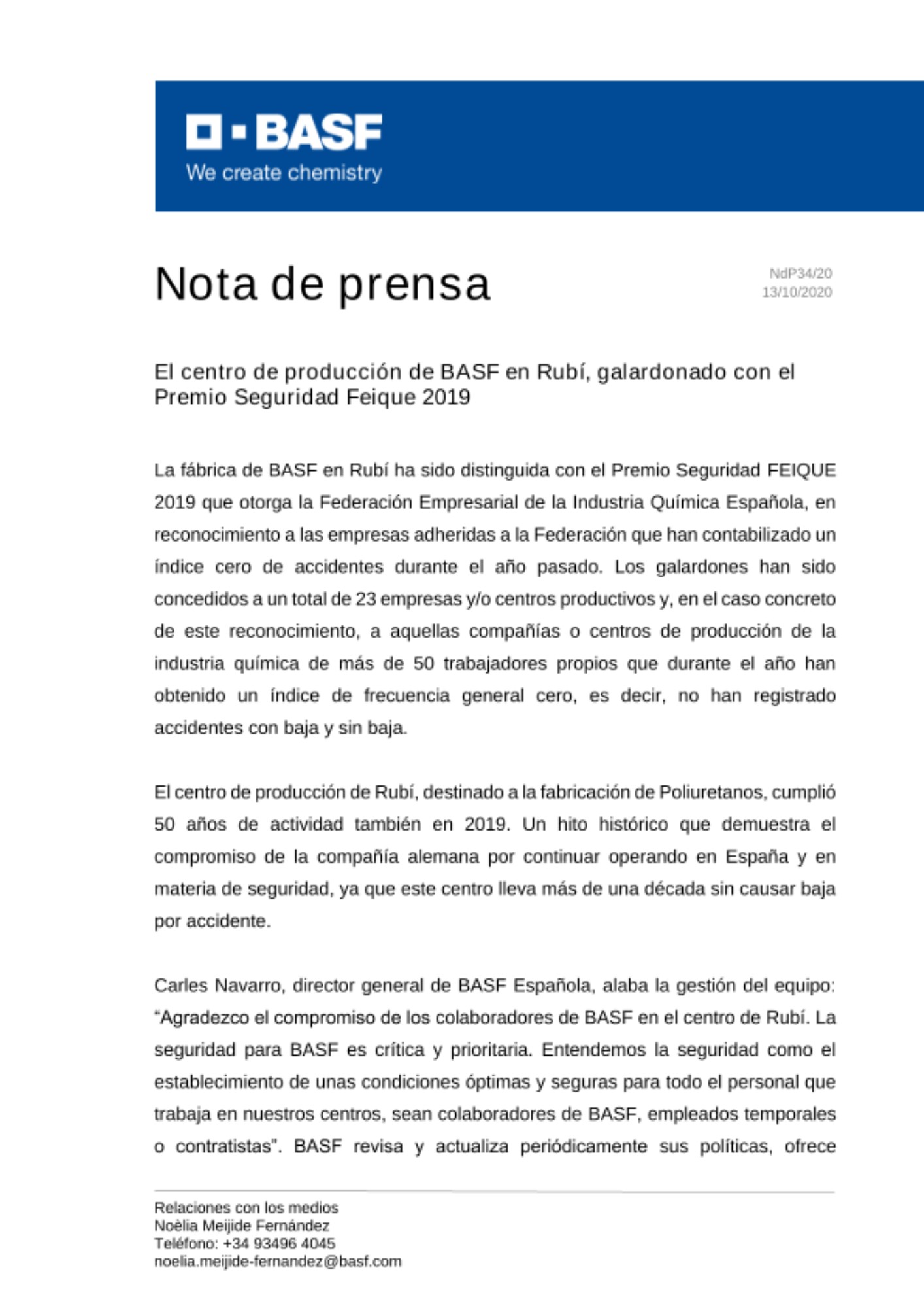 La fábrica de BASF en Rubí ha sido distinguida con el Premio Seguridad FEIQUE 2019 que otorga la Federación Empresarial de la Industria Química Española, en reconocimiento a las empresas adheridas a la Federación que han contabilizado un índice cero de accidentes durante el año pasado. Los galardones han sido concedidos a un total de 23 empresas y/o centros productivos y, en el caso concreto de este reconocimiento, a aquellas compañías o centros de producción de la industria química de más de 50 trabajadores propios que durante el año han obtenido un índice de frecuencia general cero, es decir, no han registrado accidentes con baja y sin baja.