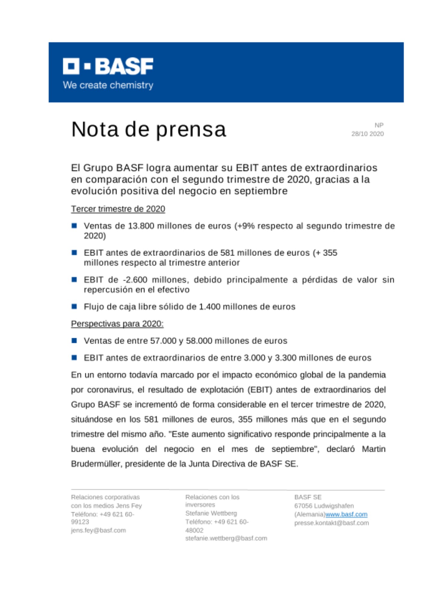 En un entorno todavía marcado por el impacto económico global de la pandemia por coronavirus, el resultado de explotación (EBIT) antes de extraordinarios del Grupo BASF se incrementó de forma considerable en el tercer trimestre de 2020, situándose en los 581 millones de euros, 355 millones más que en el segundo trimestre del mismo año. "Este aumento significativo responde principalmente a la buena evolución del negocio en el mes de septiembre", declaró Martin Brudermüller, presidente de la Junta Directiva de BASF SE.