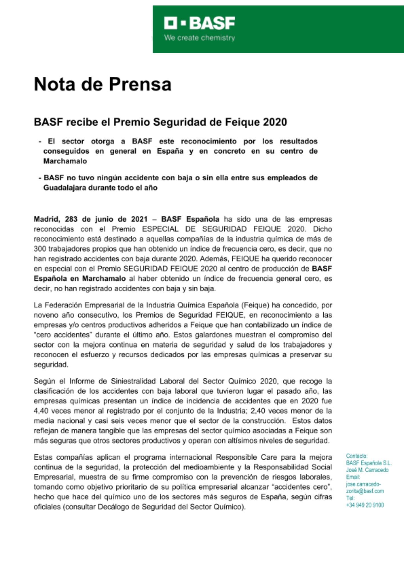 Madrid, 23 de junio de 2021 – BASF Española ha sido una de las empresas reconocidas con el Premio ESPECIAL DE SEGURIDAD FEIQUE 2020. Dicho reconocimiento está destinado a aquellas compañías de la industria química de más de 300 trabajadores propios que han obtenido un índice de frecuencia cero, es decir, que no han registrado accidentes con baja durante 2020. Además, FEIQUE ha querido reconocer en especial con el Premio SEGURIDAD FEIQUE 2020 al centro de producción de BASF Española en Marchamalo al haber obtenido un índice de frecuencia general cero, es decir, no han registrado accidentes con baja y sin baja.