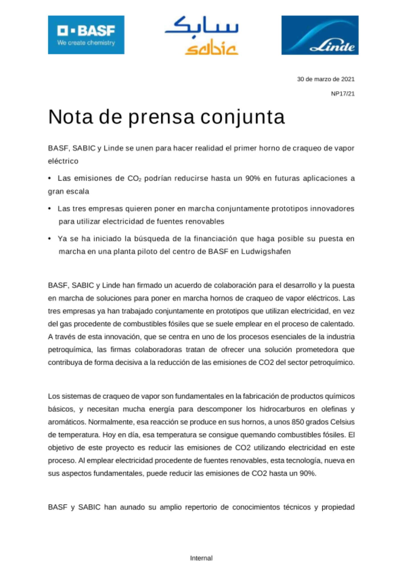 BASF, SABIC y Linde han firmado un acuerdo de colaboración para el desarrollo y la puesta en marcha de soluciones para poner en marcha hornos de craqueo de vapor eléctricos. Las tres empresas ya han trabajado conjuntamente en prototipos que utilizan electricidad, en vez del gas procedente de combustibles fósiles que se suele emplear en el proceso de calentado. A través de esta innovación, que se centra en uno de los procesos esenciales de la industria petroquímica, las firmas colaboradoras tratan de ofrecer una solución prometedora que contribuya de forma decisiva a la reducción de las emisiones de CO2 del sector petroquímico.