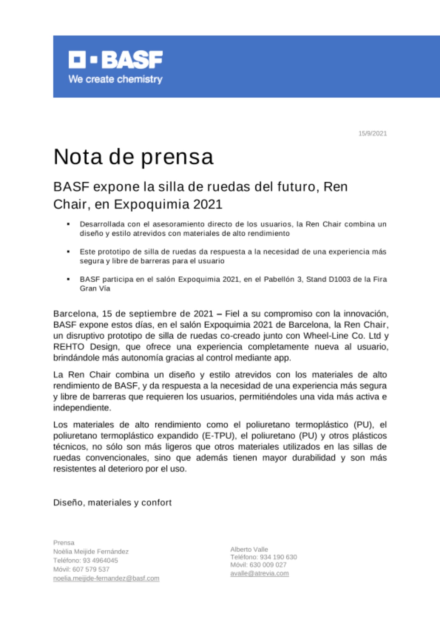 Barcelona, 14 de septiembre de 2021 – Fiel a su compromiso con la innovación, BASF expone estos días, en el salón Expoquimia 2021 de Barcelona, la Ren Chair, un disruptivo prototipo de silla de ruedas co-creado junto con Wheel-Line Co. Ltd y REHTO Design, que ofrece una experiencia completamente nueva al usuario, brindándole más autonomía gracias al control mediante app.