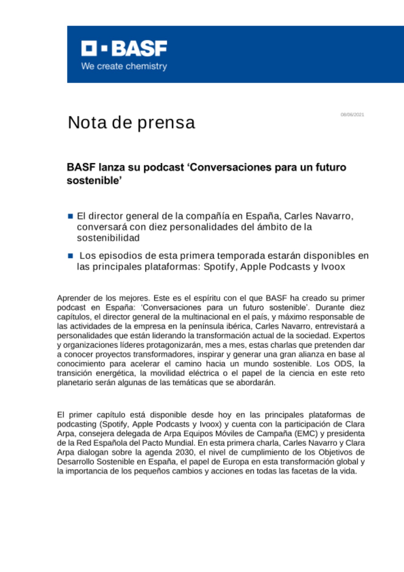 Aprender de los mejores. Este es el espíritu con el que BASF ha creado su primer podcast en España: ‘Conversaciones para un futuro sostenible’. Durante diez capítulos, el director general de la multinacional en el país, y máximo responsable de las actividades de la empresa en la península ibérica, Carles Navarro, entrevistará a personalidades que están liderando la transformación actual de la sociedad. Expertos y organizaciones líderes protagonizarán, mes a mes, estas charlas que pretenden dar a conocer proyectos transformadores, inspirar y generar una gran alianza en base al conocimiento para acelerar el camino hacia un mundo sostenible. Los ODS, la transición energética, la movilidad eléctrica o el papel de la ciencia en este reto planetario serán algunas de las temáticas que se abordarán.