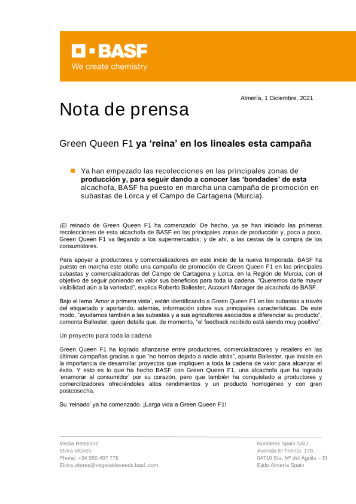 Para apoyar a productores y comercializadores en este inicio de la nueva temporada, BASF ha puesto en marcha este otoño una campaña de promoción de Green Queen F1 en las principales subastas y comercializadoras del Campo de Cartagena y Lorca, en la Región de Murcia, con el objetivo de seguir poniendo en valor sus beneficios para toda la cadena. “Queremos darle mayor visibilidad aún a la variedad”, explica Roberto Ballester, Account Manager de alcachofa de BASF.