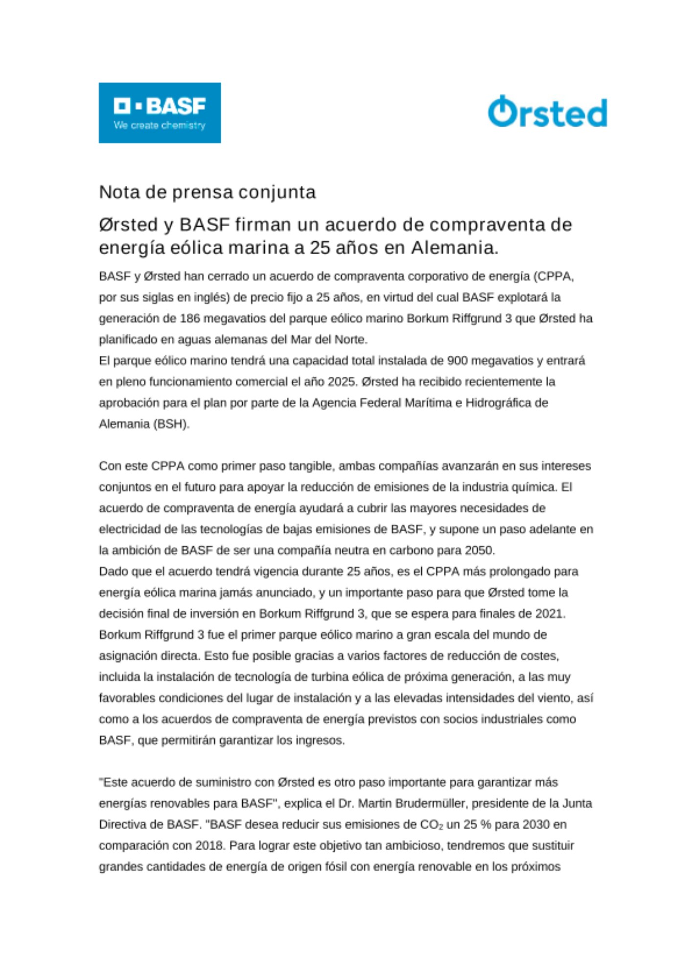 "Este acuerdo de suministro con Ørsted es otro paso importante para garantizar más energías renovables para BASF", explica el Dr. Martin Brudermüller, presidente de la Junta Directiva de BASF. "BASF desea reducir sus emisiones de CO2 un 25% para 2030 en comparación con 2018. Para lograr este objetivo tan ambicioso, tendremos que sustituir grandes cantidades de energía de origen fósil con energía renovable en los próximos años. Ørsted puede proporcionar las cantidades adicionales requeridas mediante la construcción de nuevos parques eólicos que apoyen nuestra transformación energética".