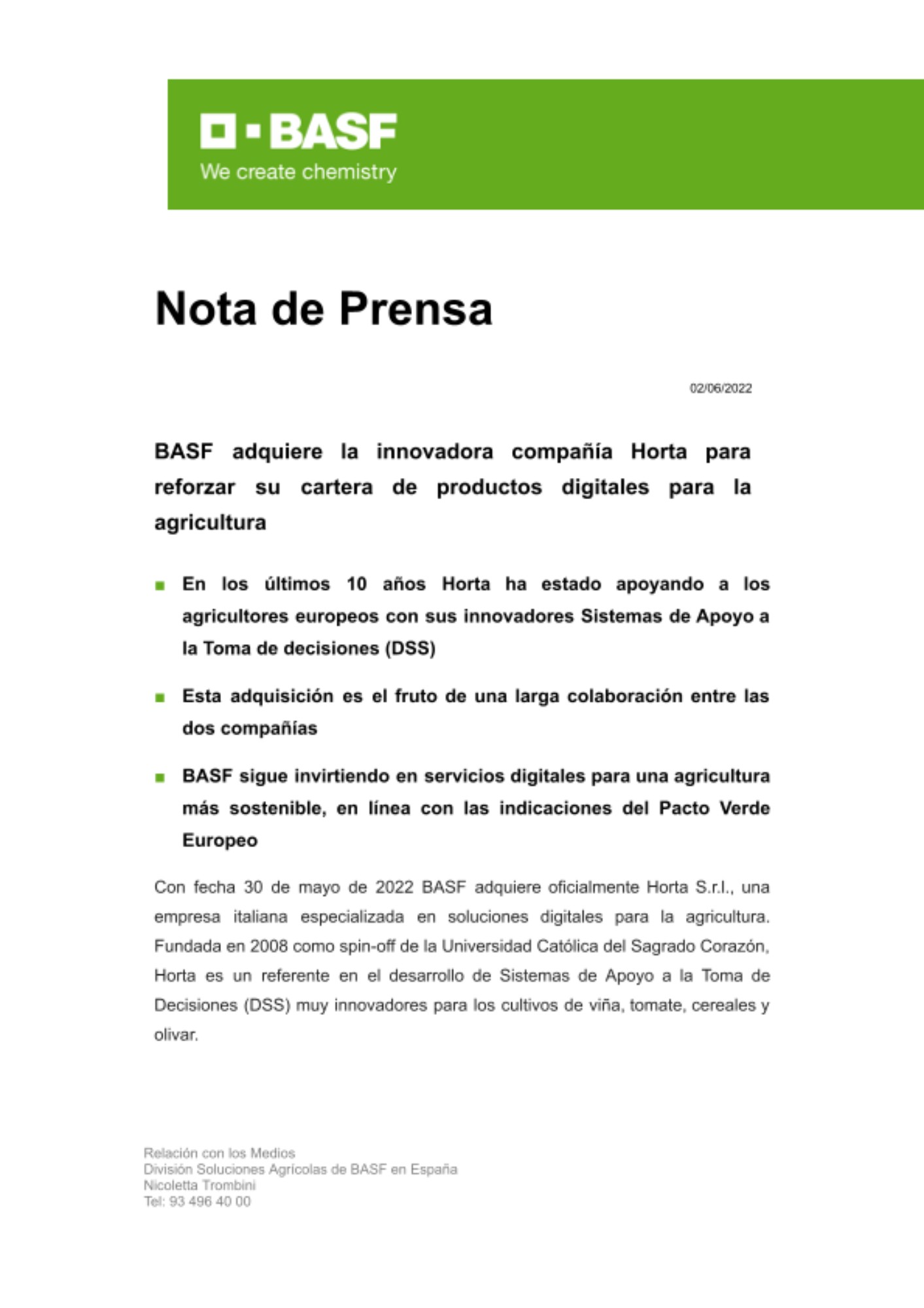 Con fecha 30 de mayo de 2022 BASF adquiere oficialmente Horta S.r.l., una empresa italiana especializada en soluciones digitales para la agricultura. Fundada en 2008 como spin-off de la Universidad Católica del Sagrado Corazón, Horta es un referente en el desarrollo de Sistemas de Apoyo a la Toma de Decisiones (DSS) muy innovadores para los cultivos de viña, tomate, cereales y olivar.