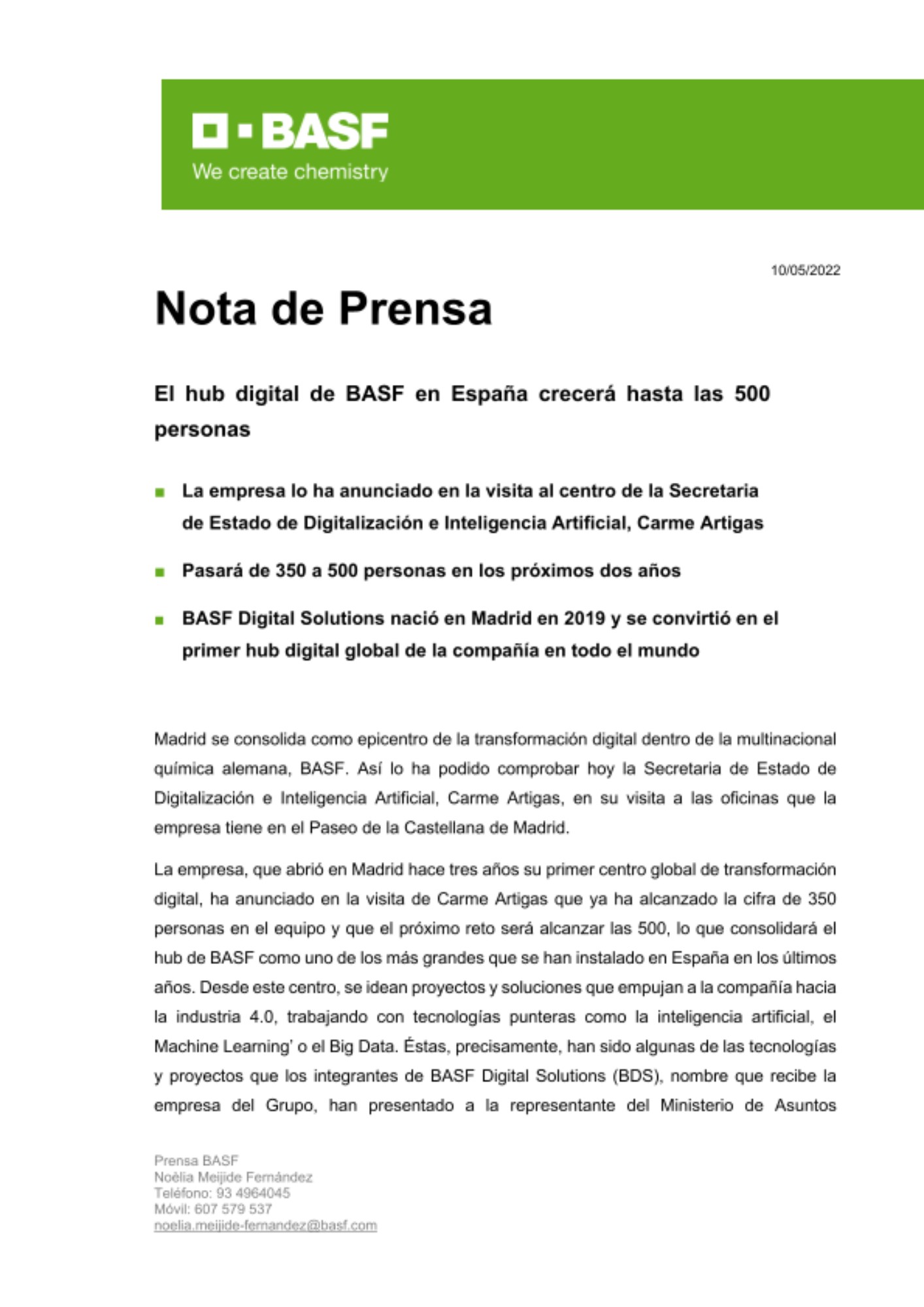 Madrid se consolida como epicentro de la transformación digital dentro de la multinacional química alemana, BASF. Así lo ha podido comprobar hoy la Secretaria de Estado de Digitalización e Inteligencia Artificial, Carme Artigas, en su visita a las oficinas que la empresa tiene en el Paseo de la Castellana de Madrid.