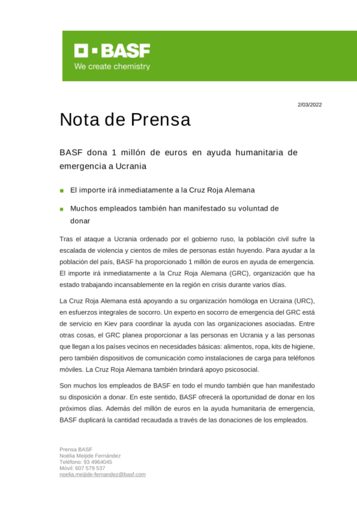 Tras el ataque a Ucrania ordenado por el gobierno ruso, la población civil sufre la escalada de violencia y cientos de miles de personas están huyendo. Para ayudar a la población del país, BASF ha proporcionado 1 millón de euros en ayuda de emergencia. El importe irá inmediatamente a la Cruz Roja Alemana (GRC), organización que ha estado trabajando incansablemente en la región en crisis durante varios días.