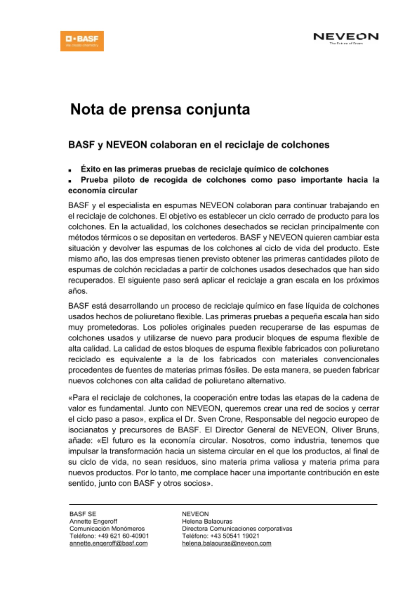 «Para el reciclaje de colchones, la cooperación entre todas las etapas de la cadena de valor es fundamental. Junto con NEVEON, queremos crear una red de socios y cerrar el ciclo paso a paso», explica el Dr. Sven Crone, Responsable del negocio europeo de isocianatos y precursores de BASF. El Director General de NEVEON, Oliver Bruns, añade: «El futuro es la economía circular. Nosotros, como industria, tenemos que impulsar la transformación hacia un sistema circular en el que los productos, al final de su ciclo de vida, no sean residuos, sino materia prima valiosa y materia prima para nuevos productos. Por lo tanto, me complace hacer una importante contribución en este sentido, junto con BASF y otros socios».