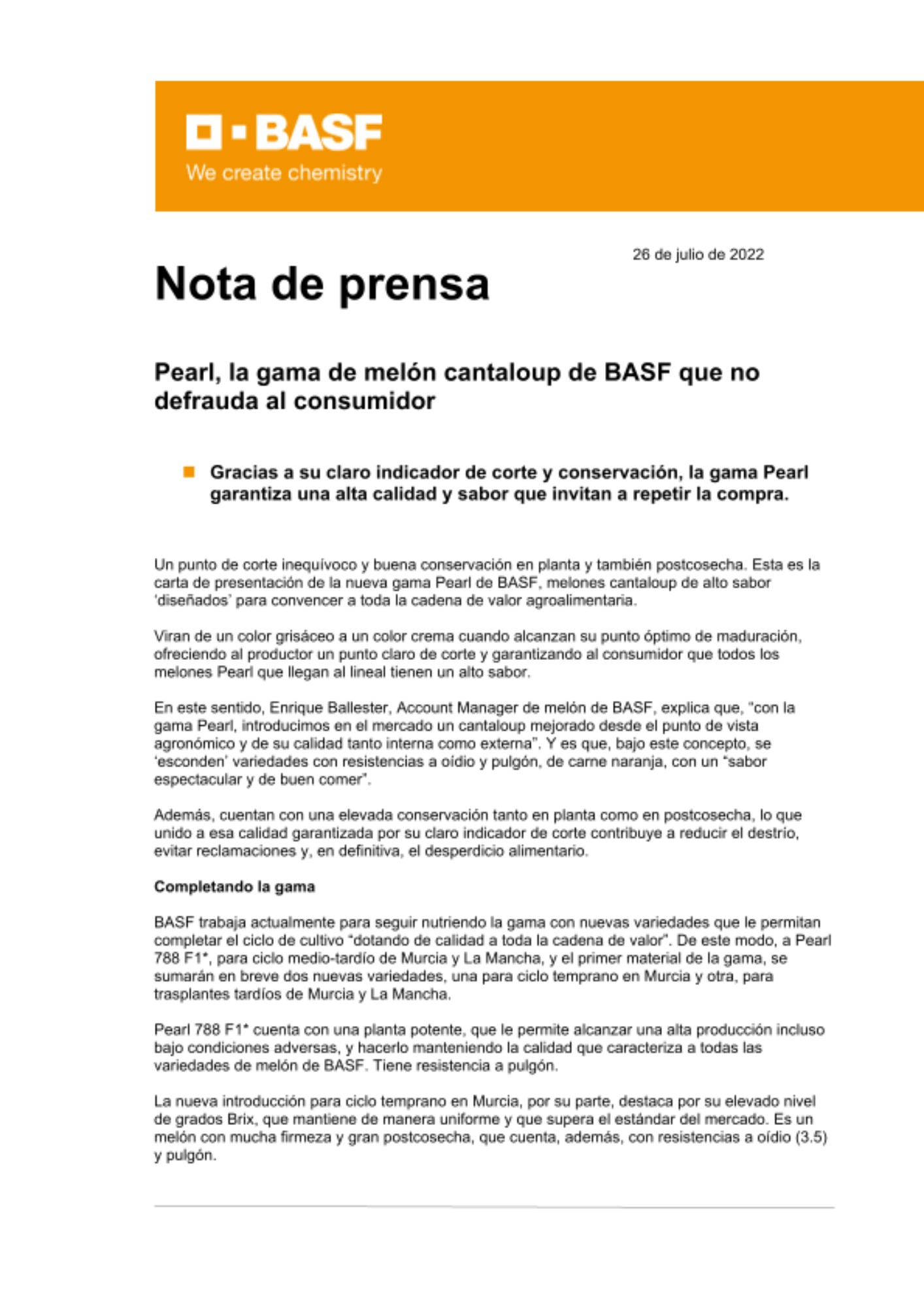 En definitiva, gracias a su gama Pearl, BASF da la oportunidad al sector de disponer de un melón cantaloup de gran calidad durante toda la campaña gracias a su punto de corte inequívoco. De este modo, no defrauda al consumidor, que puede tener la certeza de que llevará a su hogar un melón que cumplirá con todas sus expectativas y, al final, repetirá la compra, contribuyendo a la rotación en el lineal.