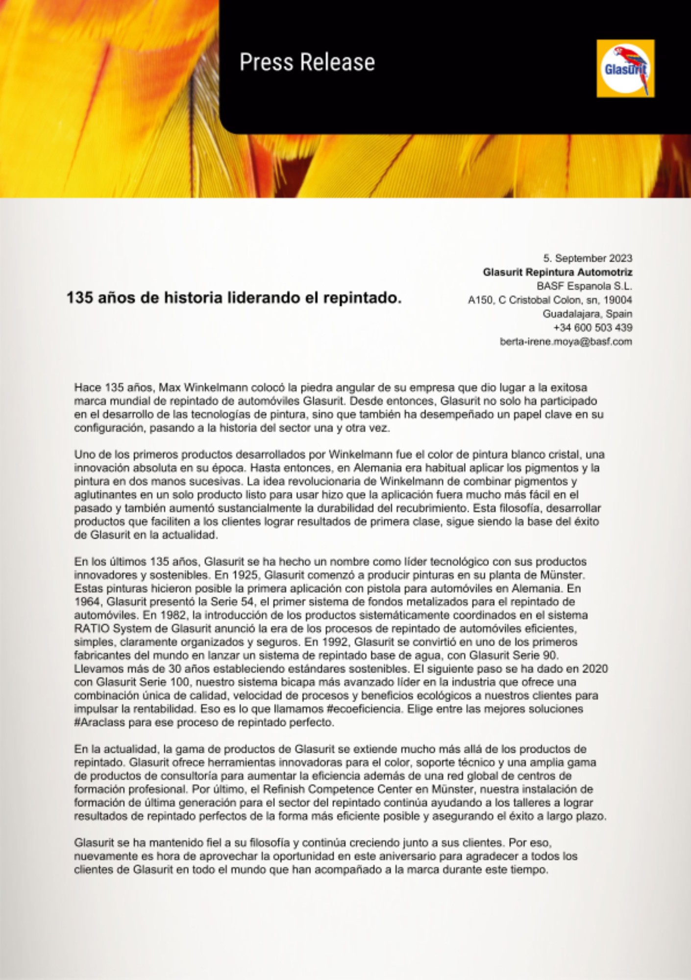 Bajo la marca Glasurit, BASF comercializa una amplia gama de sistemas de pintura para el repintado del automóvil, centrándose en Tecnología de Color Ecoeficiente base agua y con alto contenido en sólidos. Glasurit garantiza el cumplimiento de todos los requisitos legales de emisión de compuestos orgánicos volátiles (VOC) en cualquier parte del mundo, garantizando un acabado premium y alcanzando los más altos estándares de calidad demandados por nuestro mercado.