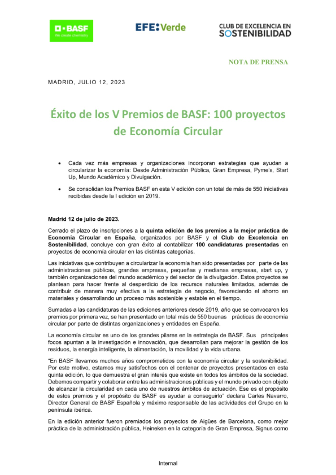 “En BASF llevamos muchos años comprometidos con la economía circular y la sostenibilidad. Por este motivo, estamos muy satisfechos con el centenar de proyectos presentados en esta quinta edición, lo que demuestra el gran interés que existe en todos los ámbitos de la sociedad. Debemos compartir y colaborar entre las administraciones públicas y el mundo privado con objeto de alcanzar la circularidad en cada uno de nuestros ámbitos de actuación. Ese es el propósito de estos premios y el propósito de BASF es ayudar a conseguirlo” declara Carles Navarro, Director General de BASF Española y máximo responsable de las actividades del Grupo en la península ibérica.