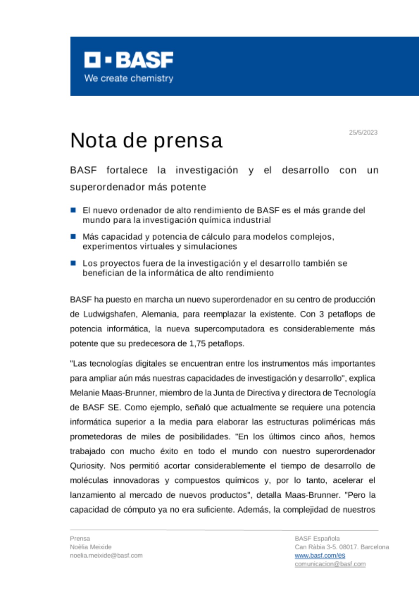 "Las tecnologías digitales se encuentran entre los instrumentos más importantes para ampliar aún más nuestras capacidades de investigación y desarrollo", explica Melanie Maas-Brunner, miembro de la Junta de Directiva y directora de Tecnología de BASF SE. Como ejemplo, señaló que actualmente se requiere una potencia informática superior a la media para elaborar las estructuras poliméricas más prometedoras de miles de posibilidades. "En los últimos cinco años, hemos trabajado con mucho éxito en todo el mundo con nuestro superordenador Quriosity. Nos permitió acortar considerablemente el tiempo de desarrollo de moléculas innovadoras y compuestos químicos y, por lo tanto, acelerar el lanzamiento al mercado de nuevos productos", detalla Maas-Brunner. "Pero la capacidad de cómputo ya no era suficiente. Además, la complejidad de nuestros proyectos de investigación y, por lo tanto, las demandas de la supercomputadora han aumentado, por lo que decidimos invertir en una nueva computadora de alto rendimiento".