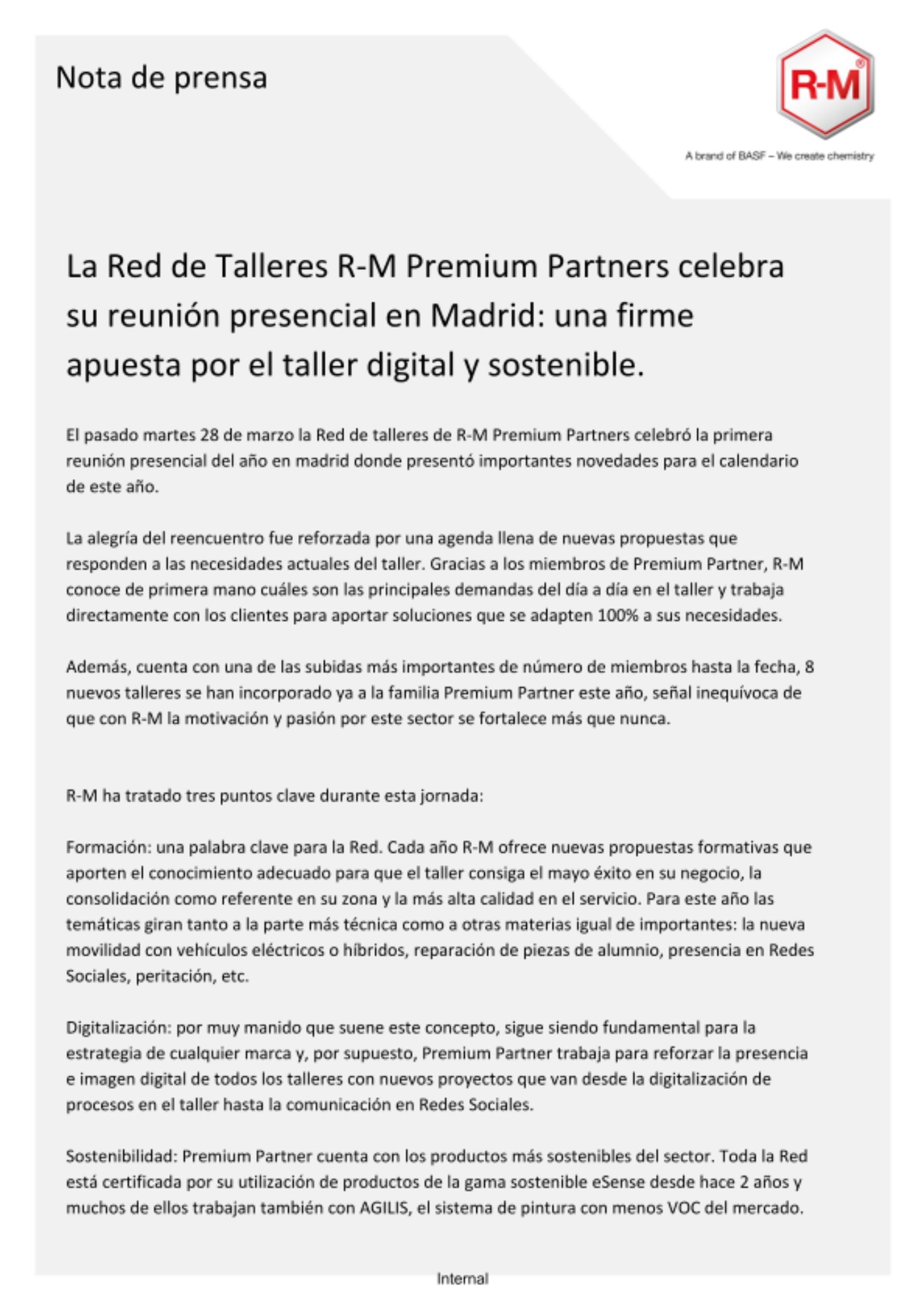 - Sostenibilidad: Premium Partner cuenta con los productos más sostenibles del sector. Toda la Red está certificada por su utilización de productos de la gama sostenible eSense desde hace 2 años y muchos de ellos trabajan también con AGILIS, el sistema de pintura con menos VOC del mercado. Para R-M es fundamental alcanzar nuevos estándares de calidad año tras año a la vez que amplia su porfolio de productos sostenible con una ecoeficiencia sin precedentes. Los talleres miembros de R-M Premium Partner cuentan con el privilegio de estar siempre a la última en esta tecnología de vanguardia y obtener información exclusiva tanto de R-M como de los partners del sector que están trabajando en esta línea para un futuro que ya es presente.