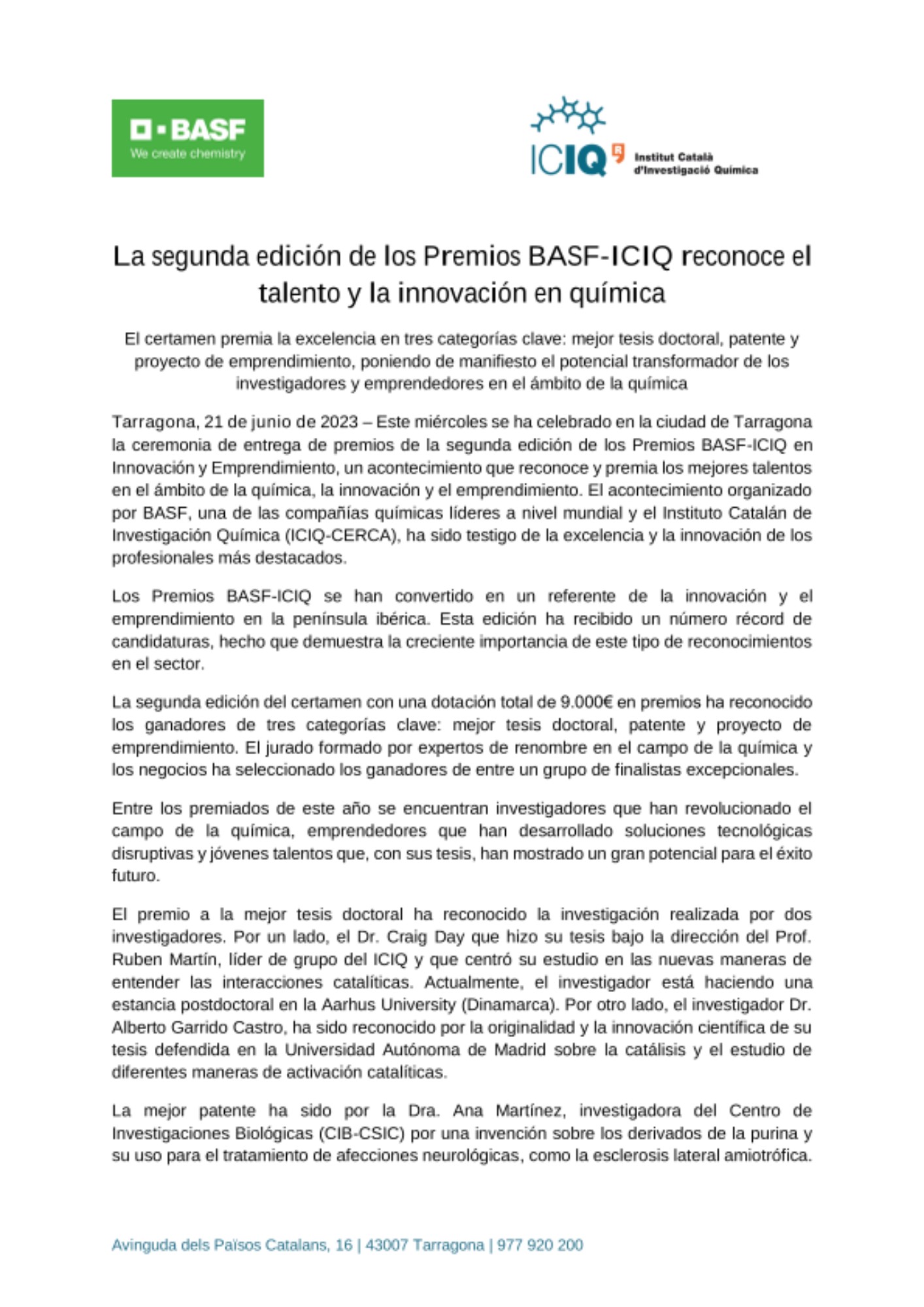 Tarragona, 21 de junio de 2023 – Este miércoles se ha celebrado en la ciudad de Tarragona la ceremonia de entrega de premios de la segunda edición de los Premios BASF-ICIQ en Innovación y Emprendimiento, un acontecimiento que reconoce y premia los mejores talentos en el ámbito de la química, la innovación y el emprendimiento. El acontecimiento organizado por BASF, una de las compañías químicas líderes a nivel mundial y el Instituto Catalán de Investigación Química (ICIQ-CERCA), ha sido testigo de la excelencia y la innovación de los profesionales más destacados.