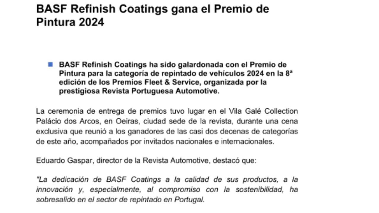 - BASF Refinish Coatings ha sido galardonada con el Premio de Pintura para la categoría de repintado de vehículos 2024 en la 8ª edición de los Premios Fleet & Service, organizada por la prestigiosa Revista Portuguesa Automotive.