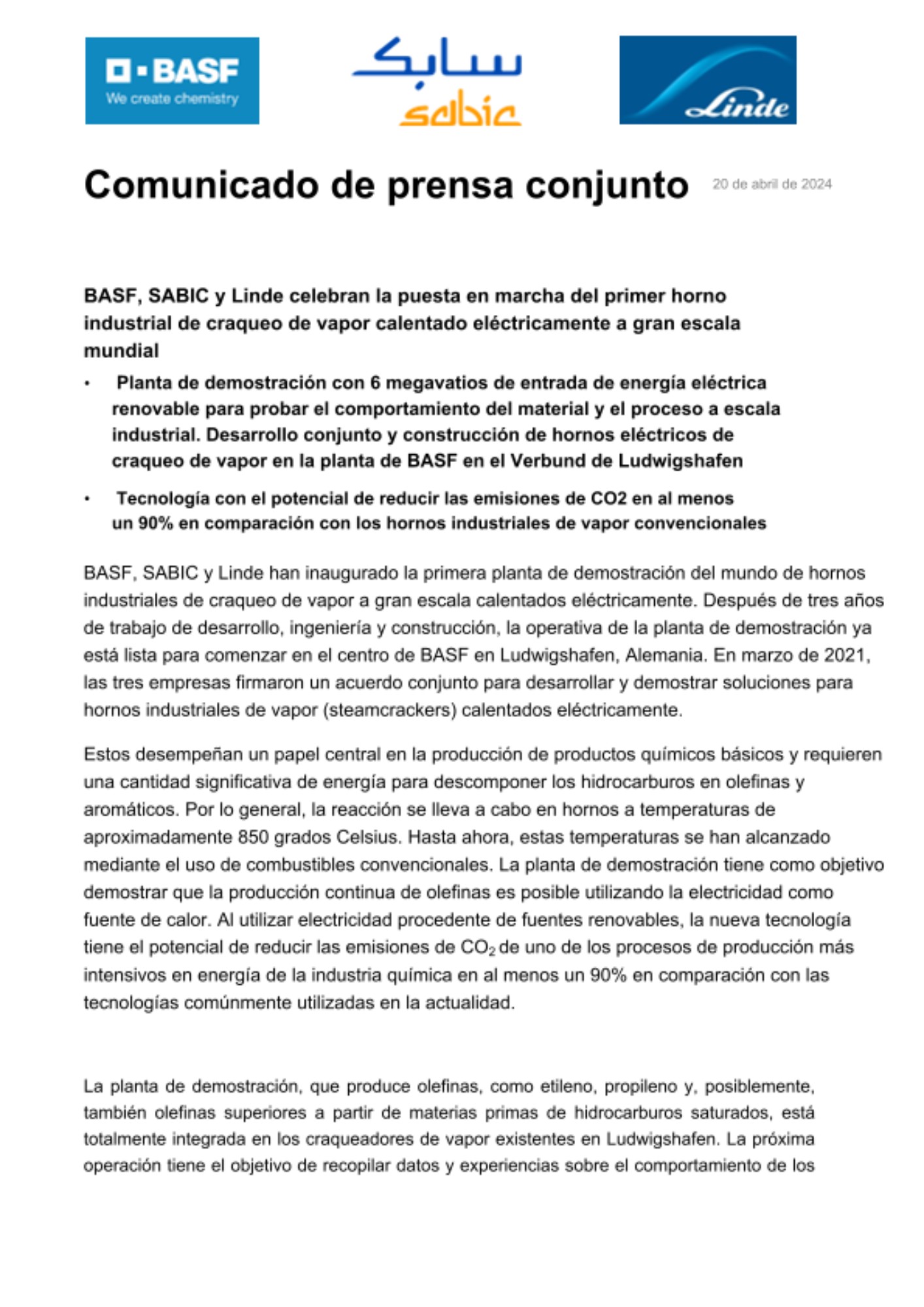 "Nuestro objetivo común es demostrar que es posible electrificar la industria petroquímica y operar un horno industrial de vapor con electricidad generada de manera sostenible. Este destacado proyecto conjunto es una prueba significativa de cómo juntos podemos desarrollar tecnologías innovadoras que nos harán avanzar en el camino hacia las cero emisiones netas de CO2 y la neutralidad climática", dijo Jürgen Nowicki, CEO de Linde Engineering.