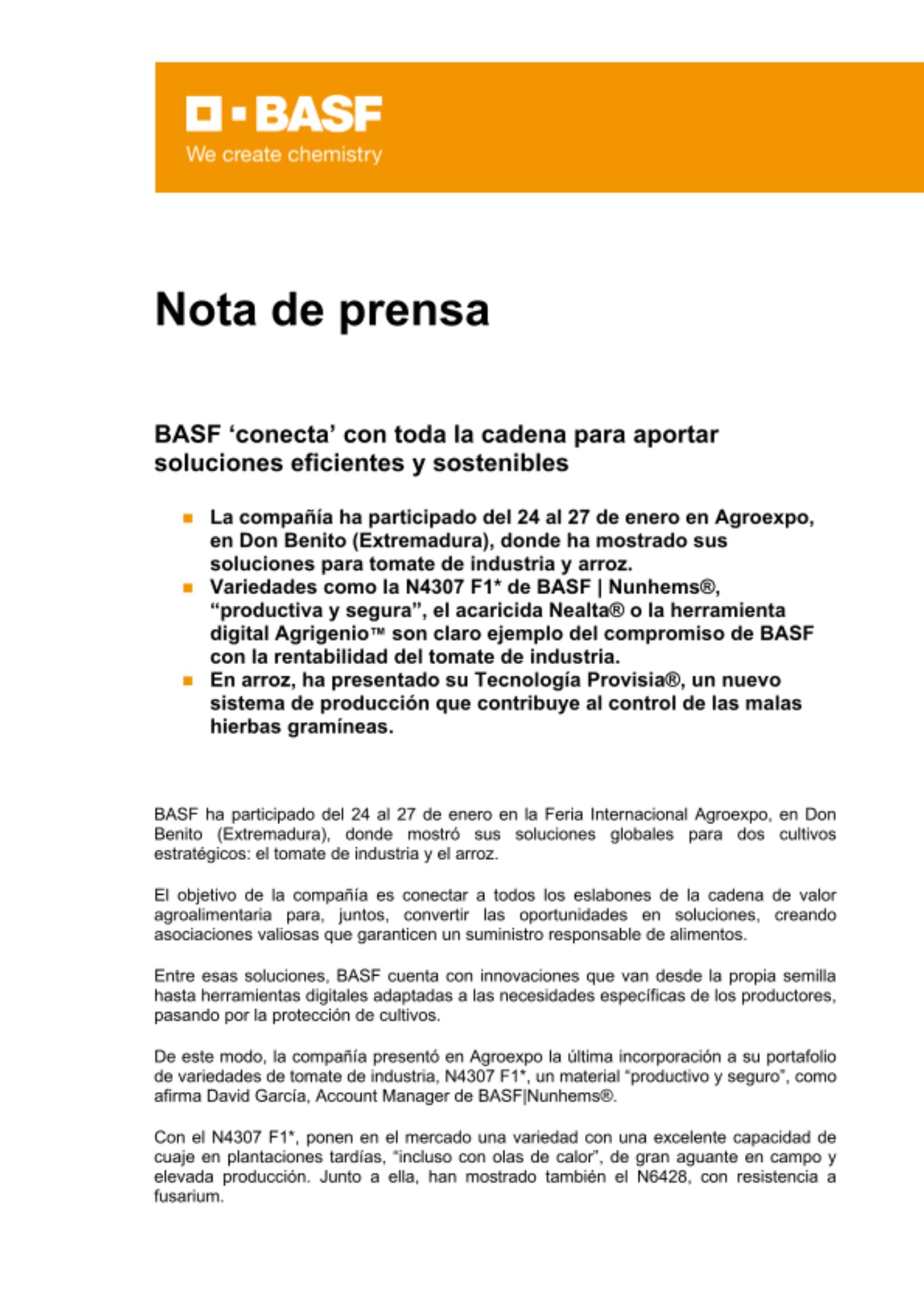 - Variedades como la N4307 F1* de BASF | Nunhems®, “productiva y segura”, el acaricida Nealta® o la herramienta digital Agrigenio™ son claro ejemplo del compromiso de BASF con la rentabilidad del tomate de industria.