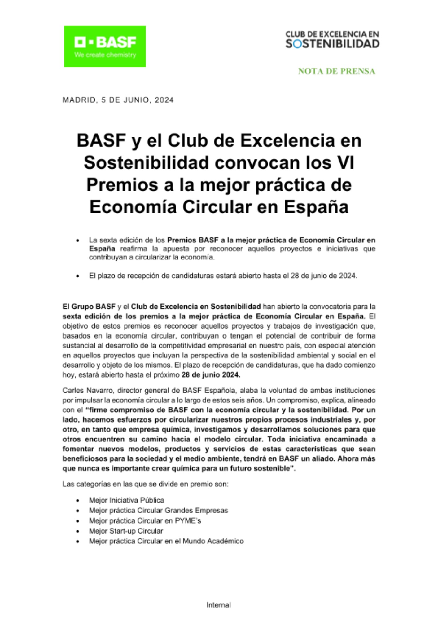 El Grupo BASF y el Club de Excelencia en Sostenibilidad han abierto la convocatoria para la sexta edición de los premios a la mejor práctica de Economía Circular en España. El objetivo de estos premios es reconocer aquellos proyectos y trabajos de investigación que, basados en la economía circular, contribuyan o tengan el potencial de contribuir de forma sustancial al desarrollo de la competitividad empresarial en nuestro país, con especial atención en aquellos proyectos que incluyan la perspectiva de la sostenibilidad ambiental y social en el desarrollo y objeto de los mismos. El plazo de recepción de candidaturas, que ha dado comienzo hoy, estará abierto hasta el próximo 28 de junio 2024.