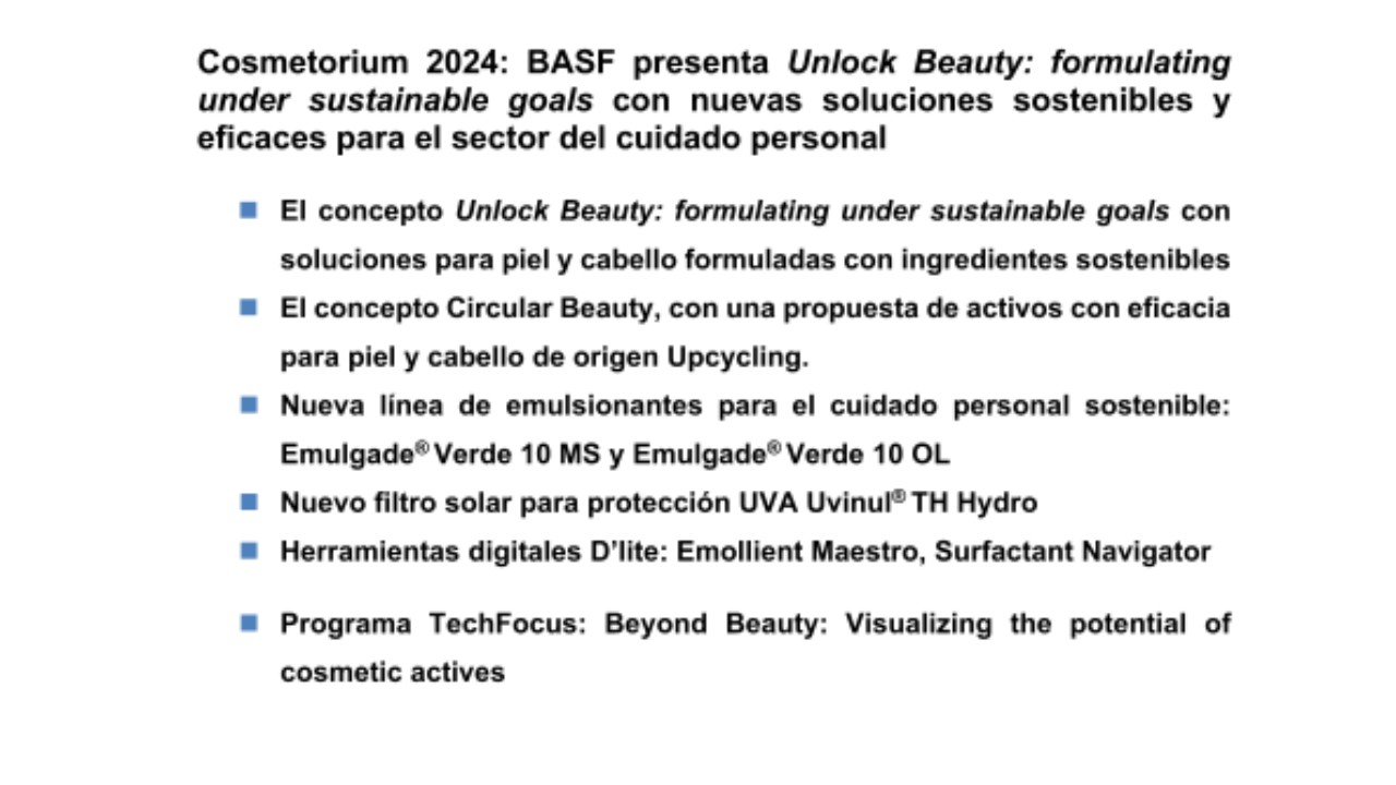 Cosmetorium 2024: BASF presenta Unlock Beauty: formulating under sustainable goals con nuevas soluciones sostenibles y eficaces para el sector del cuidado personal