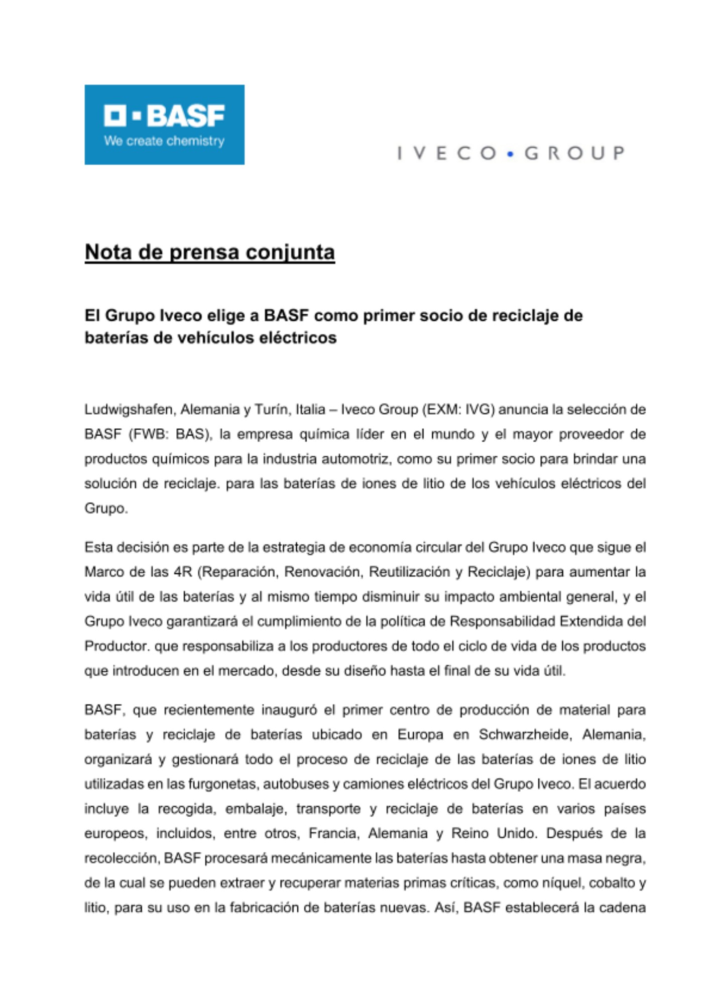 BASF, que recientemente inauguró el primer centro de producción de material para baterías y reciclaje de baterías ubicado en Europa en Schwarzheide, Alemania, organizará y gestionará todo el proceso de reciclaje de las baterías de iones de litio utilizadas en las furgonetas, autobuses y camiones eléctricos del Grupo Iveco. El acuerdo incluye la recogida, embalaje, transporte y reciclaje de baterías en varios países europeos, incluidos, entre otros, Francia, Alemania y Reino Unido. Después de la recolección, BASF procesará mecánicamente las baterías hasta obtener una masa negra, de la cual se pueden extraer y recuperar materias primas críticas, como níquel, cobalto y litio, para su uso en la fabricación de baterías nuevas. Así, BASF establecerá la cadena de valor completa del reciclaje de baterías en Europa para proporcionar localmente metales reciclados con una baja huella de carbono para la industria de las baterías.