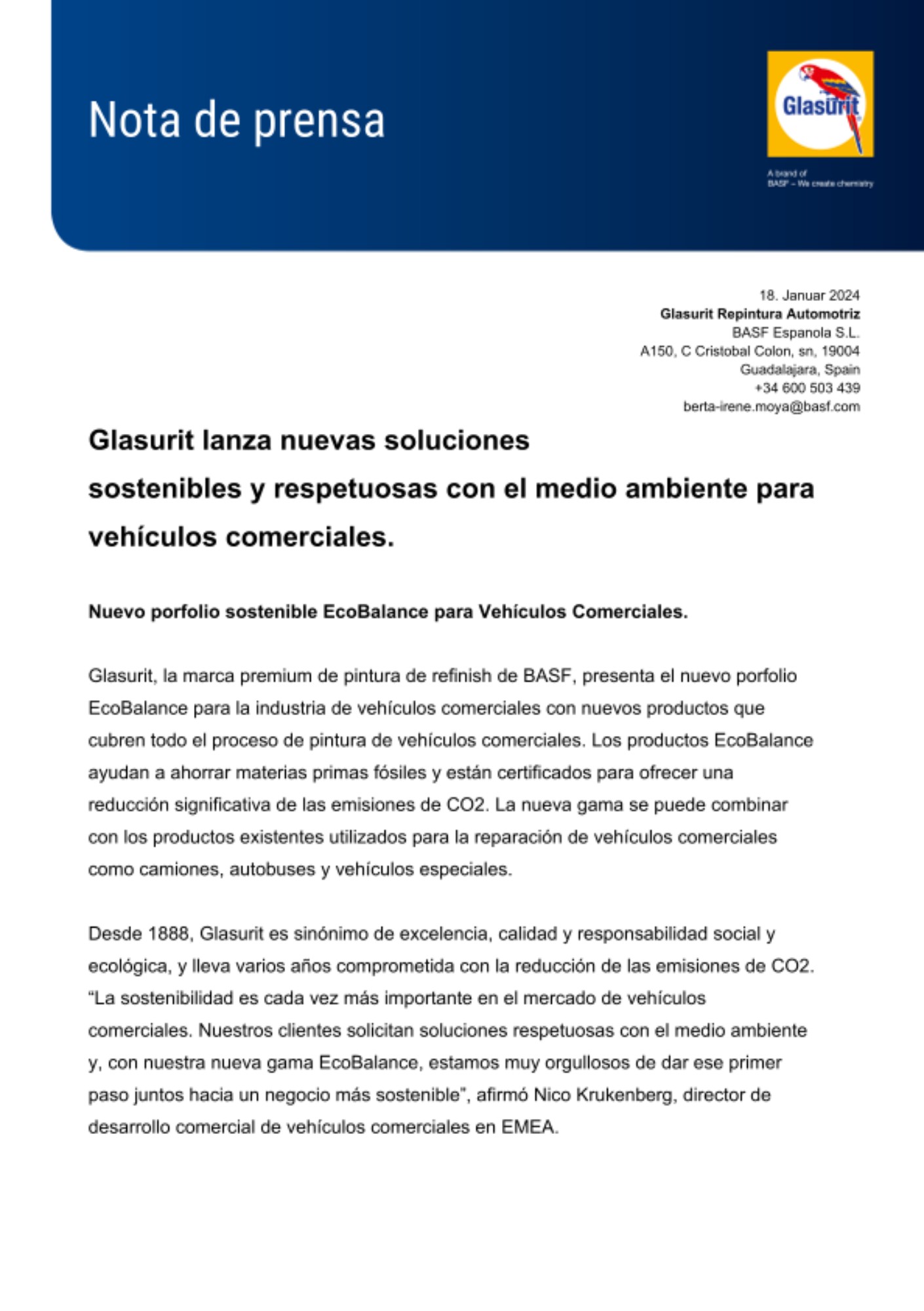 Desde 1888, Glasurit es sinónimo de excelencia, calidad y responsabilidad social y ecológica, y lleva varios años comprometida con la reducción de las emisiones de CO2. “La sostenibilidad es cada vez más importante en el mercado de vehículos comerciales. Nuestros clientes solicitan soluciones respetuosas con el medio ambiente y, con nuestra nueva gama EcoBalance, estamos muy orgullosos de dar ese primer paso juntos hacia un negocio más sostenible”, afirmó Nico Krukenberg, director de desarrollo comercial de vehículos comerciales en EMEA.